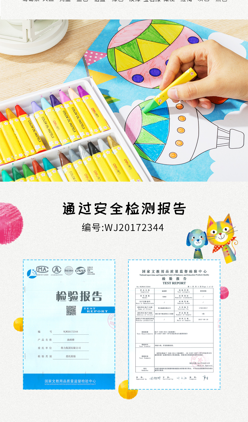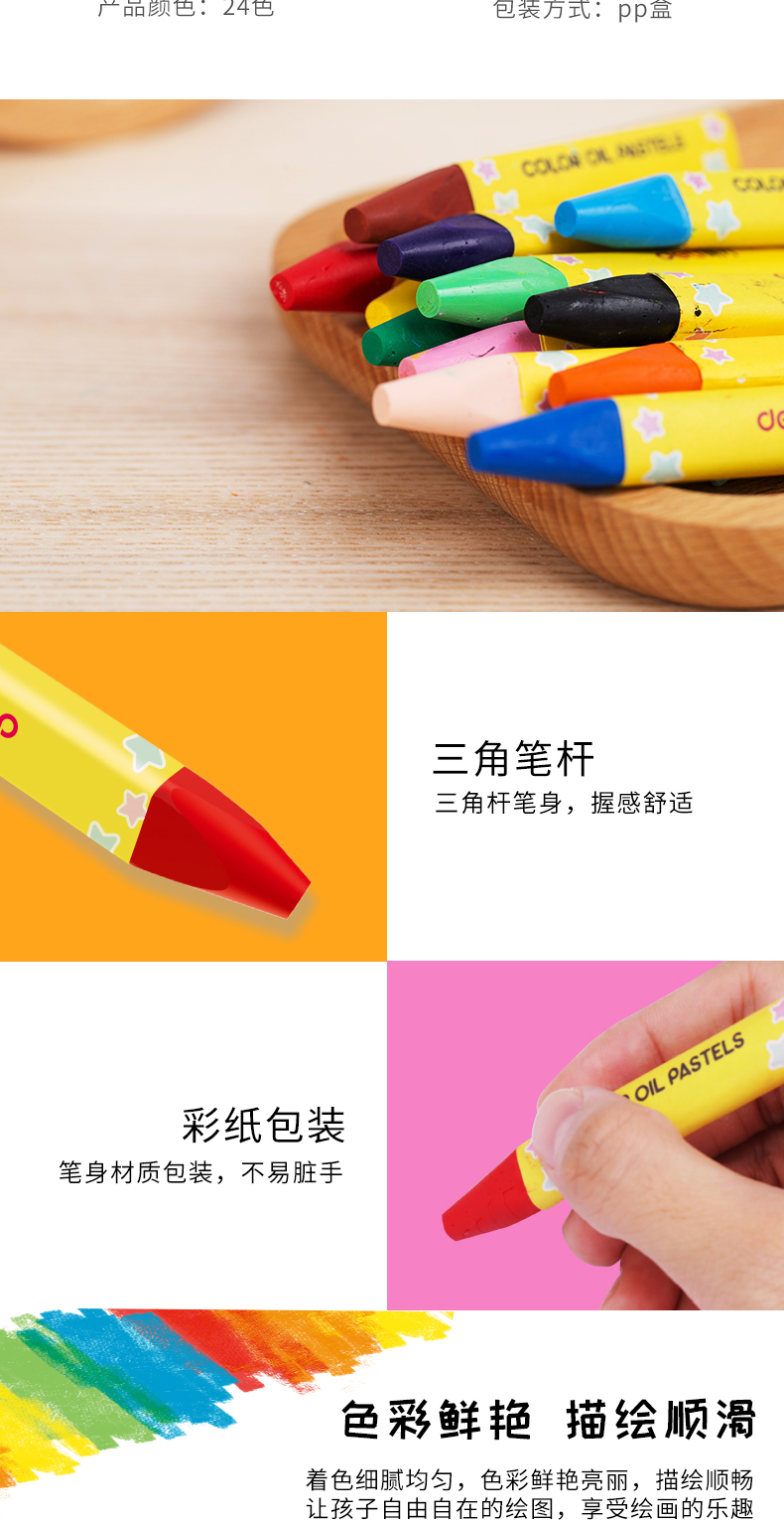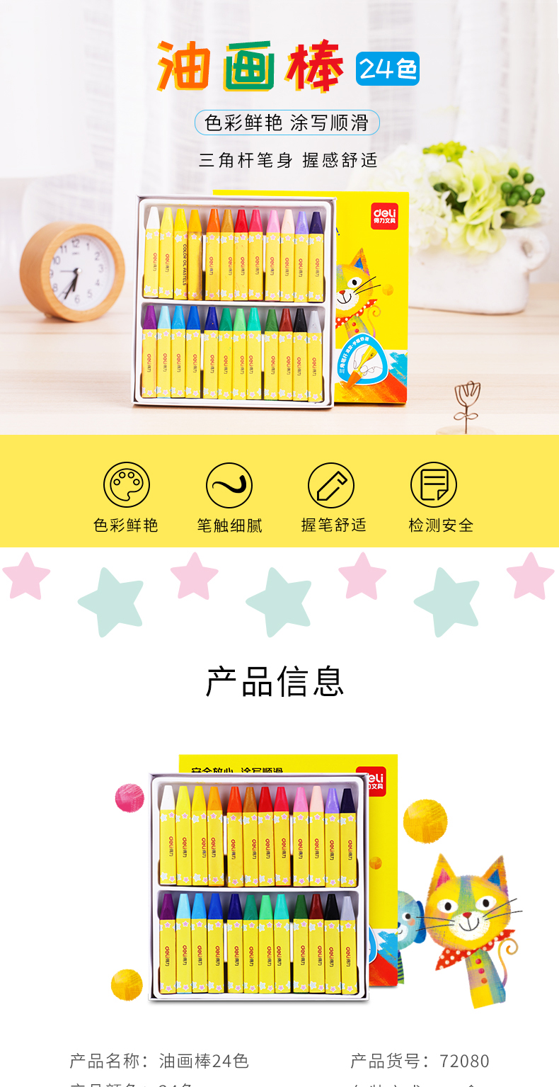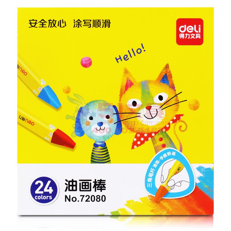 商品名称:得力72080,24色儿童油画棒三角杆炫彩蜡笔涂写流畅学生文具油画笔盒装 商品编号:11.05.02.72080 品牌:得力/deli 上架时间:2018-08-23 商品毛重:0克 颜色数:24色 包装含量:1/20/80 如果您发现商品信息不准确,欢迎纠错;如果您发现有比51文具价格更低的,欢迎举报