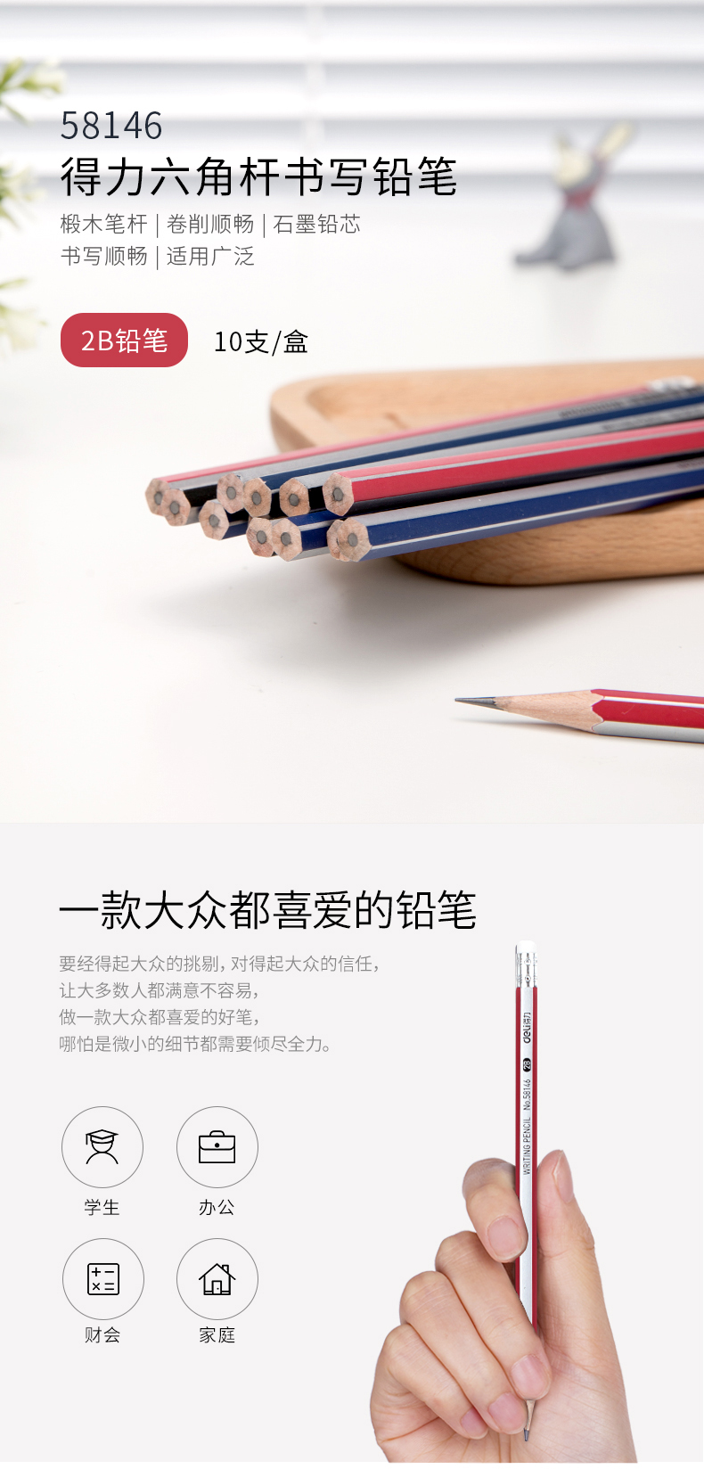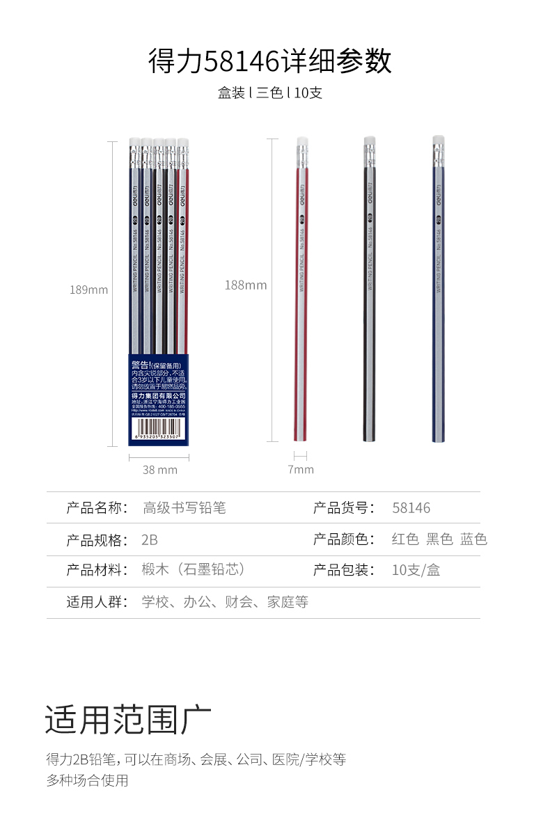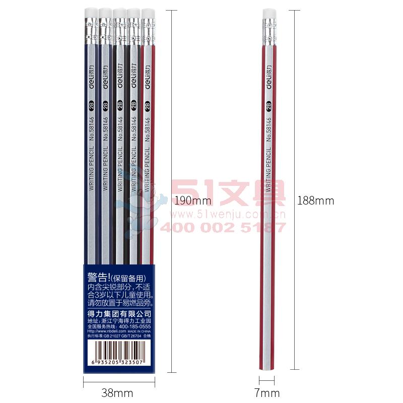 商品名称:得力58146,2B铅笔带橡皮头六角杆铅笔小学生写字笔 商品编号:11.03.03.58146 品牌:得力/deli 上架时间:2018-08-24 商品毛重:0克 类型:2B 是否带橡皮头:带 包装方式:1/12/288 如果您发现商品信息不准确,欢迎纠错;如果您发现有比51文具价格更低的,欢迎举报