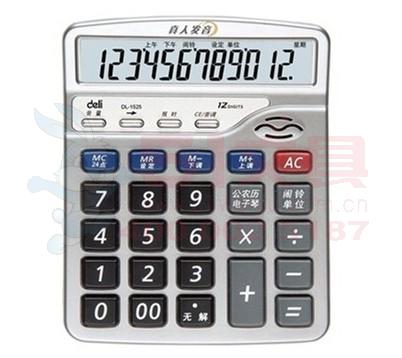商品名称:得力1525,语音型计算器 商品编号:12.04.31.1525 品牌:文具/LZN 上架时间:2014-09-23 商品毛重:0克 含量:1/20/80 起订量:个 如果您发现商品信息不准确,欢迎纠错;如果您发现有比51文具价格更低的,欢迎举报 产品名称:Deli/得力 1525 品牌: Deli/得力 型号: 1525 类型: 办公便携型 屏幕材质: LCD 屏幕最大显示位数: 12位数 适配电池类型: 普通干电池
