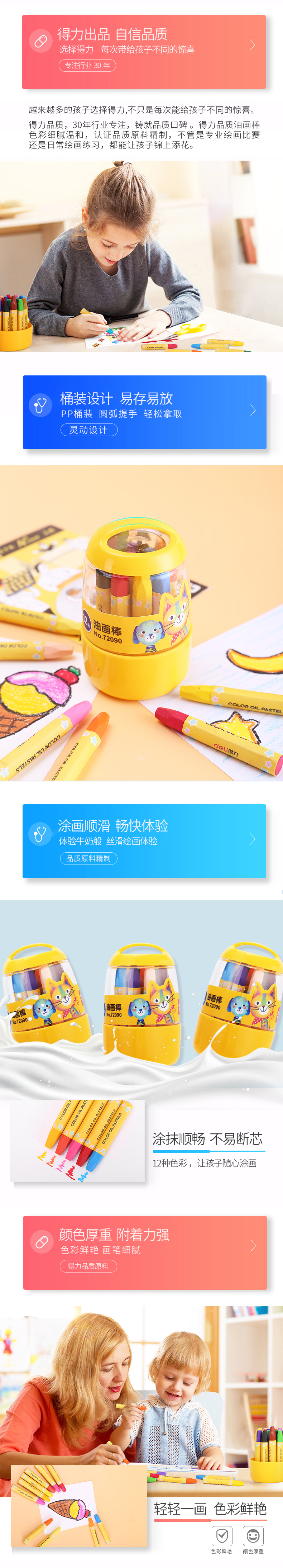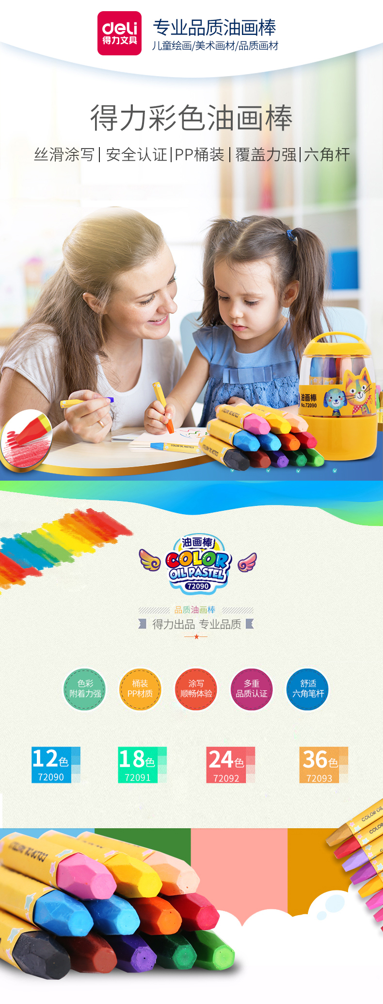 商品名称:得力72091,18色桶装油画棒学生儿童画画不脏手蜡笔绘画笔涂鸦绘画安全 商品编号:11.05.02.72091 品牌:得力/deli 上架时间:2018-09-01 商品毛重:0克 颜色数:18色 包装含量:1/12/96 如果您发现商品信息不准确,欢迎纠错;如果您发现有比51文具价格更低的,欢迎举报