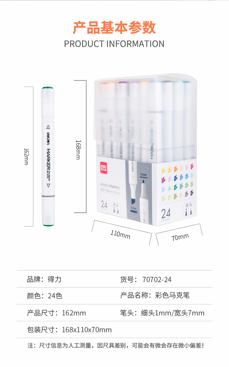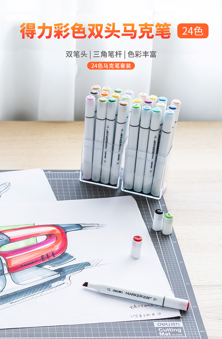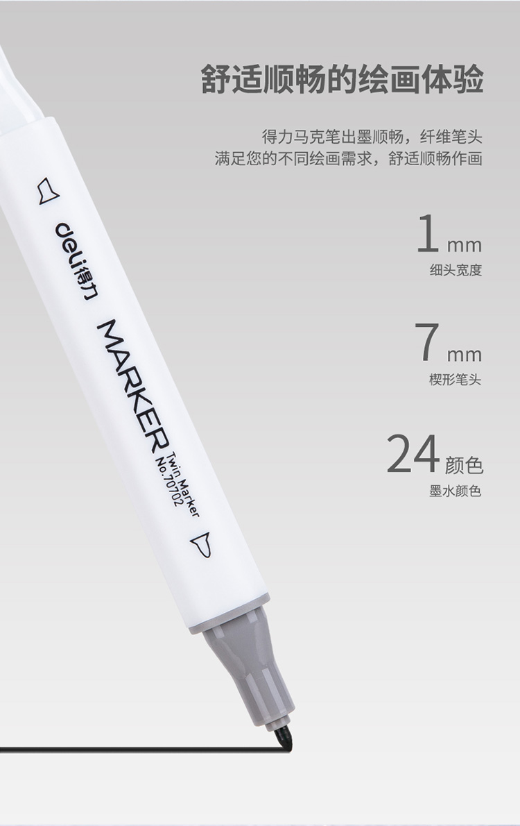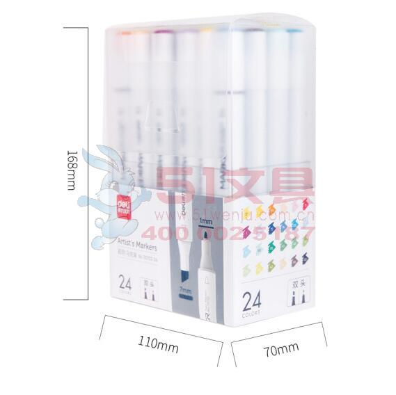 商品名称:得力70702-24,24色三角杆双头马克笔(1/24)酒精油性马克笔套装 学生手绘漫画设计绘画彩笔画笔记号笔 商品编号:11.05.04.70702B 品牌:得力/deli 上架时间:2018-09-03 商品毛重:0克 颜色数:24色 包装含量:1/24 如果您发现商品信息不准确,欢迎纠错;如果您发现有比51文具价格更低的,欢迎举报