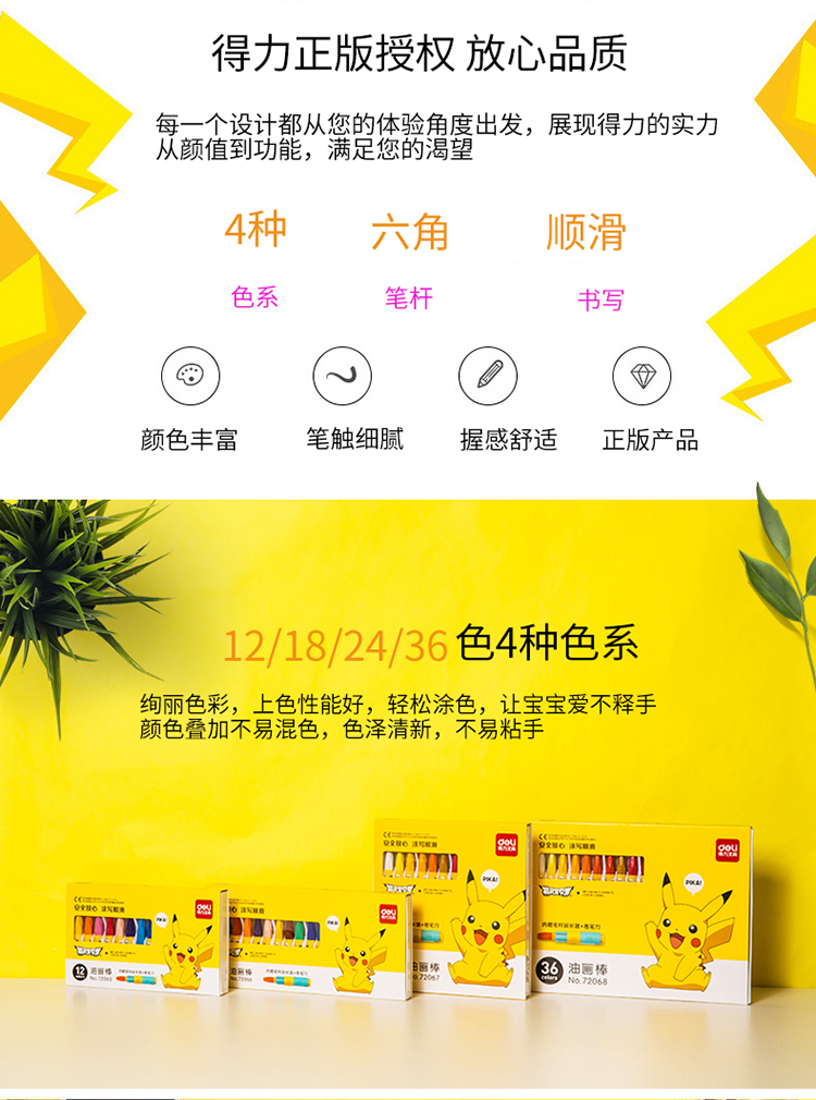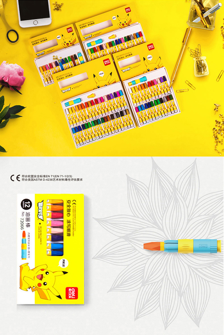 商品名称:得力72067,24色皮卡丘油画棒儿童蜡笔内增延长器不脏手安全彩画笔 商品编号:11.05.02.72067 品牌:得力/deli 上架时间:2018-09-10 商品毛重:0克 颜色数:24色 包装含量:1/12/72 如果您发现商品信息不准确,欢迎纠错;如果您发现有比51文具价格更低的,欢迎举报