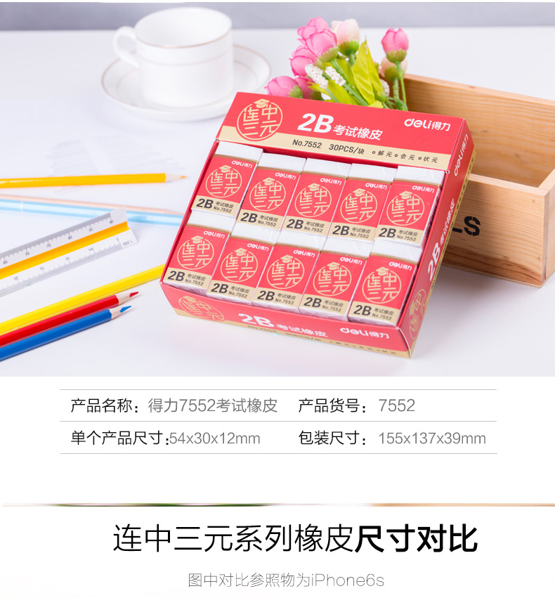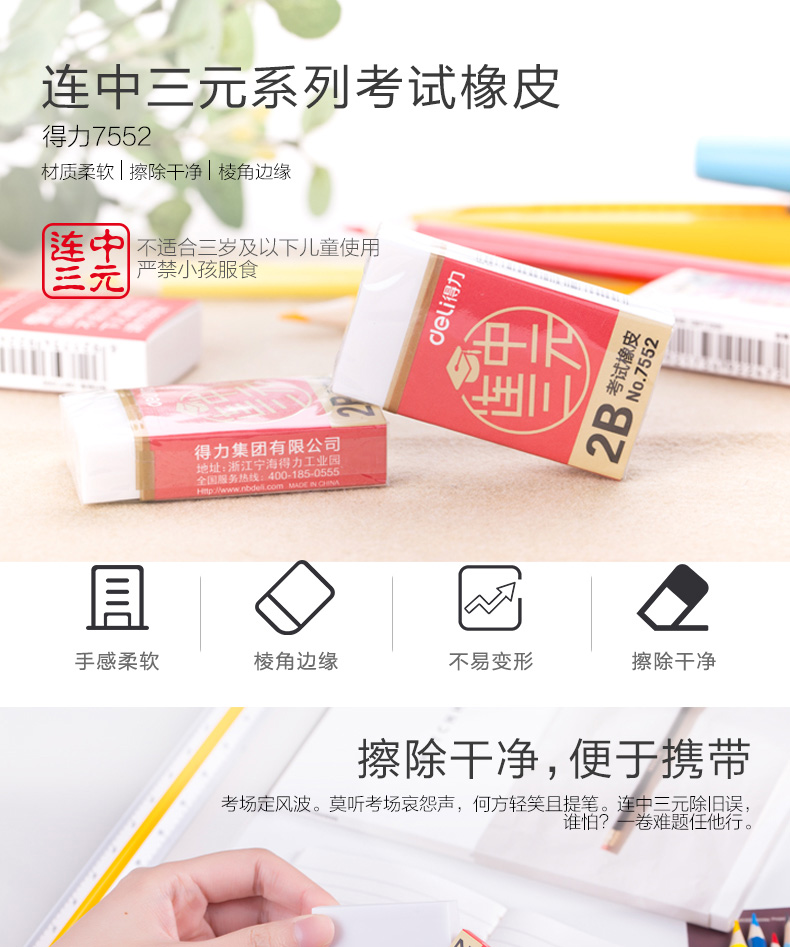 商品名称:得力7552,连中三元系列考试橡皮 白色橡皮 2B学生橡皮擦 易擦干净 商品编号:11.13.01.7552 品牌:得力/deli 上架时间:2018-09-11 商品毛重:0克 如果您发现商品信息不准确,欢迎纠错;如果您发现有比51文具价格更低的,欢迎举报
