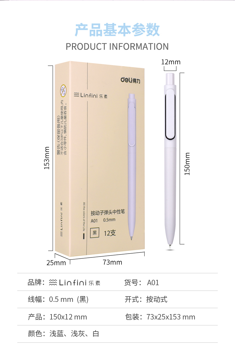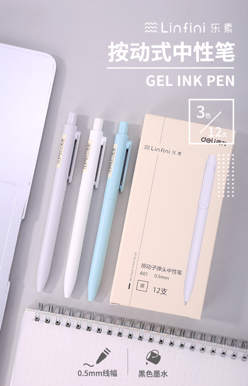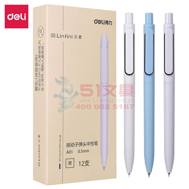 商品名称:得力A01,0.5mm学生按动中性笔 乐素系列考试书写水性笔子弹头 商品编号:11.03.01.0001E 品牌:得力/deli 上架时间:2018-09-11 商品毛重:0克 价格单位:支 笔头类型:子弹头 笔头粗细:0.5mm 包装含量:(12/144/1728) 如果您发现商品信息不准确,欢迎纠错;如果您发现有比51文具价格更低的,欢迎举报