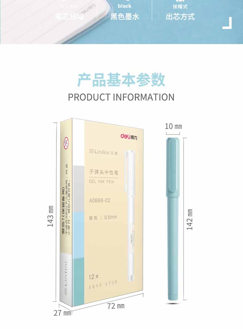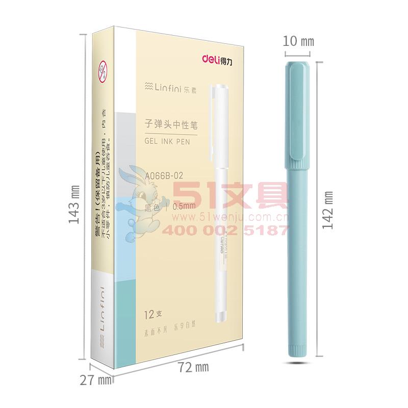 商品名称:得力A066B-02,可爱简约小清新学生中性笔0.5mm子弹头黑色碳素水笔 商品编号:11.03.01.0066D 品牌:得力/deli 上架时间:2018-09-11 商品毛重:0克 价格单位:支 笔头类型:子弹头 笔头粗细:0.5mm 包装含量:12/144/1728 如果您发现商品信息不准确,欢迎纠错;如果您发现有比51文具价格更低的,欢迎举报