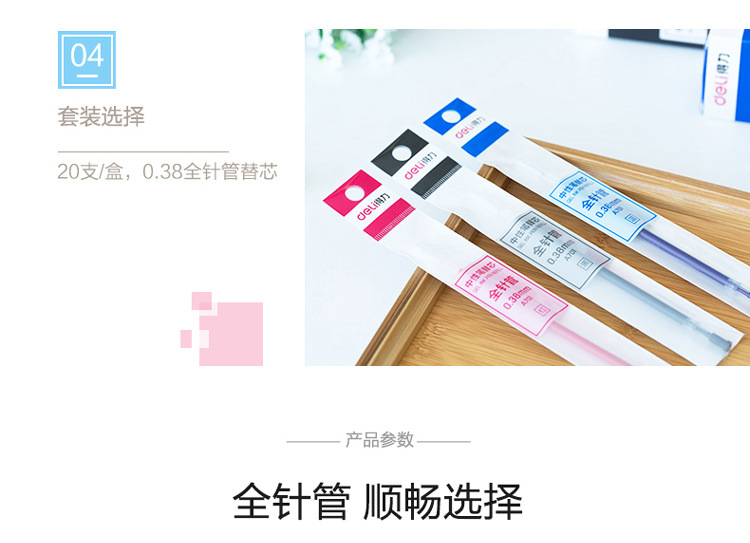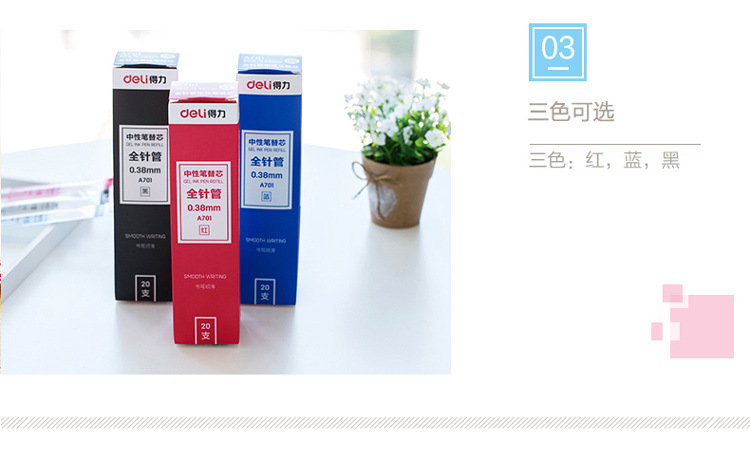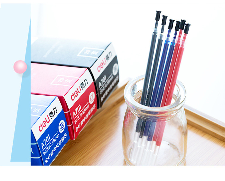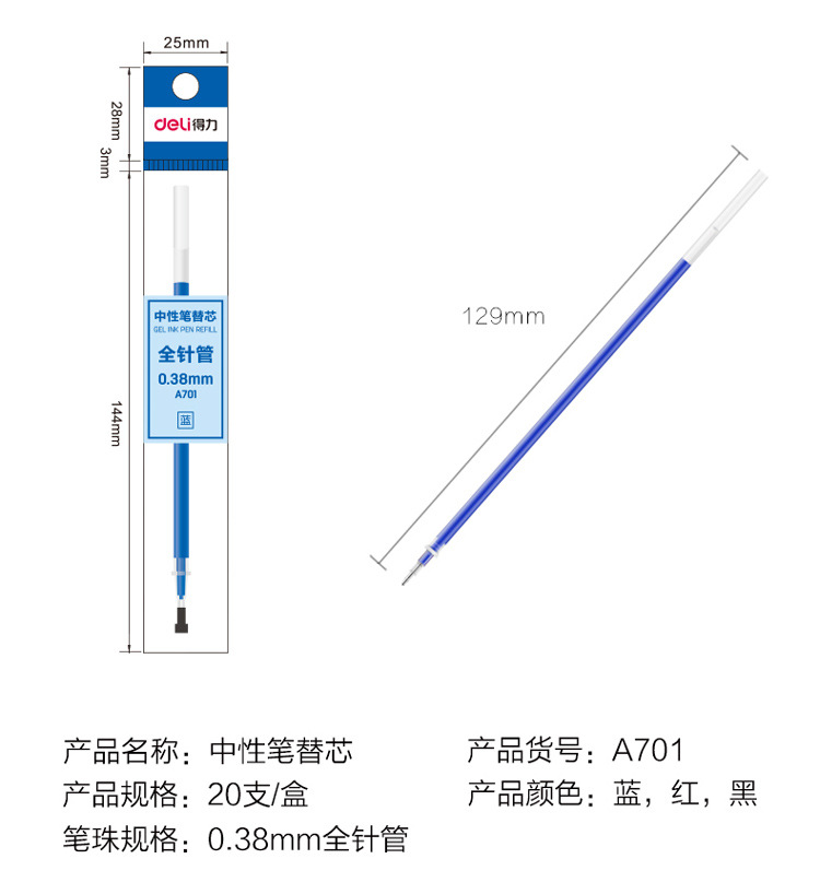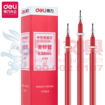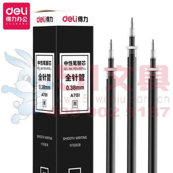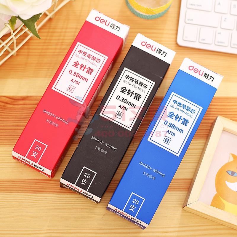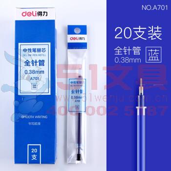 商品名称:得力A701,学生中性替芯(20/240/2880)全针管中性笔芯 0.38mm签字笔笔芯水笔替芯 商品编号:11.03.09.0701 品牌:得力/deli 上架时间:2018-09-11 商品毛重:0克 价格单位:支 笔头类型:全针管 笔头粗细:0.38mm 包装含量:1/20/2880 如果您发现商品信息不准确,欢迎纠错;如果您发现有比51文具价格更低的,欢迎举报