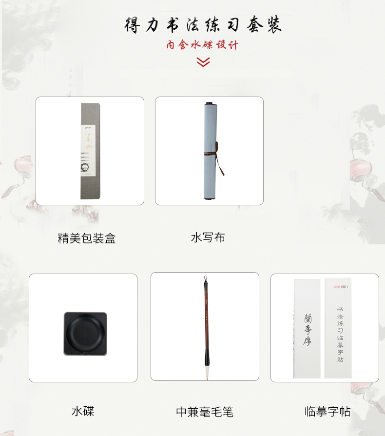 商品名称:得力74296,沁笔坊系列文房四宝套装毛笔水写布水碟临摹字帖 商品编号:11.03.31.74296 品牌:得力/deli 上架时间:2018-09-15 商品毛重:0克 如果您发现商品信息不准确,欢迎纠错;如果您发现有比51文具价格更低的,欢迎举报