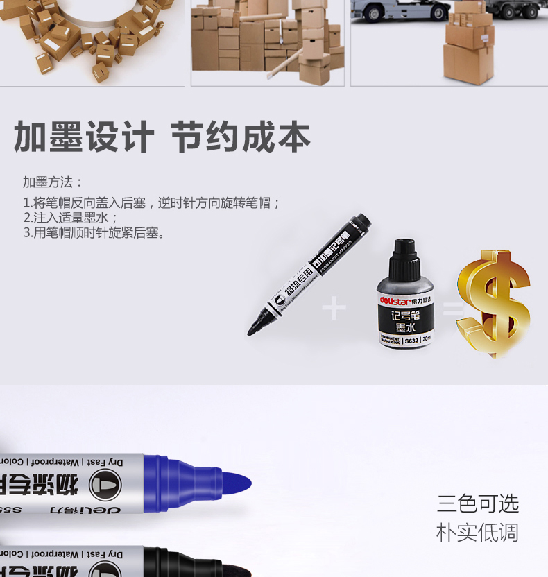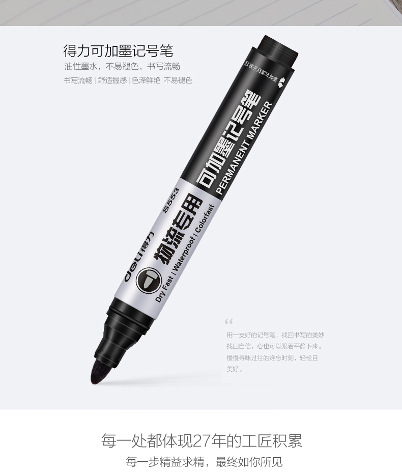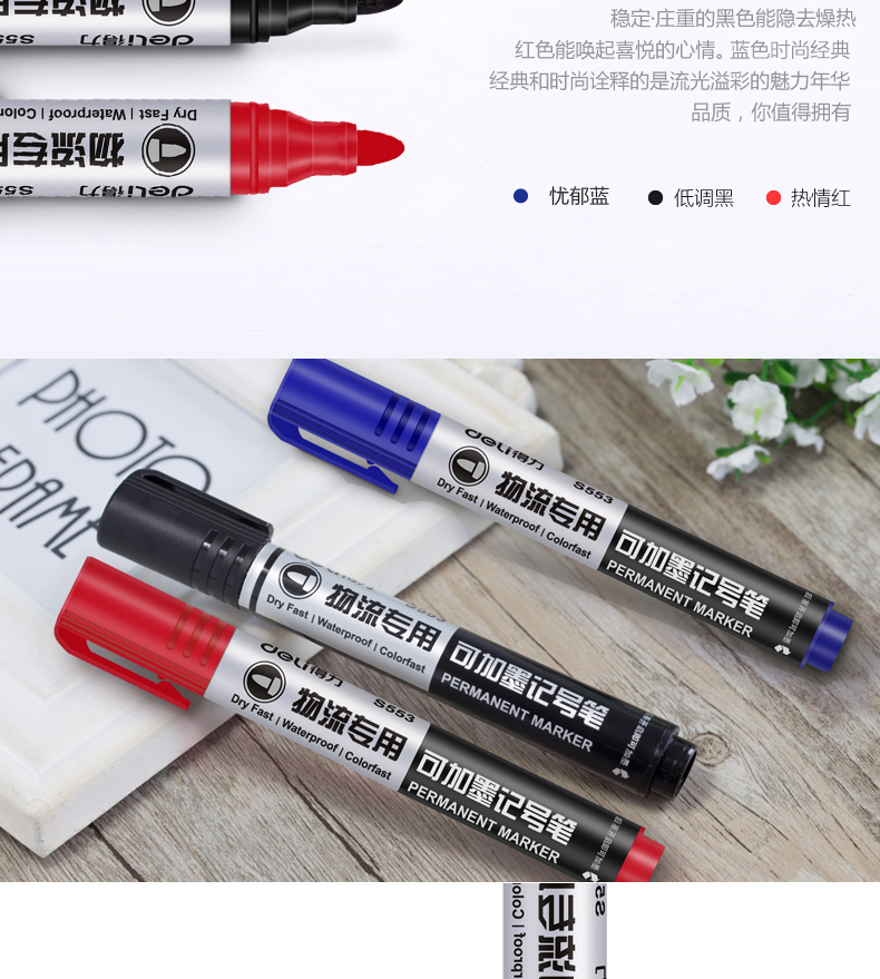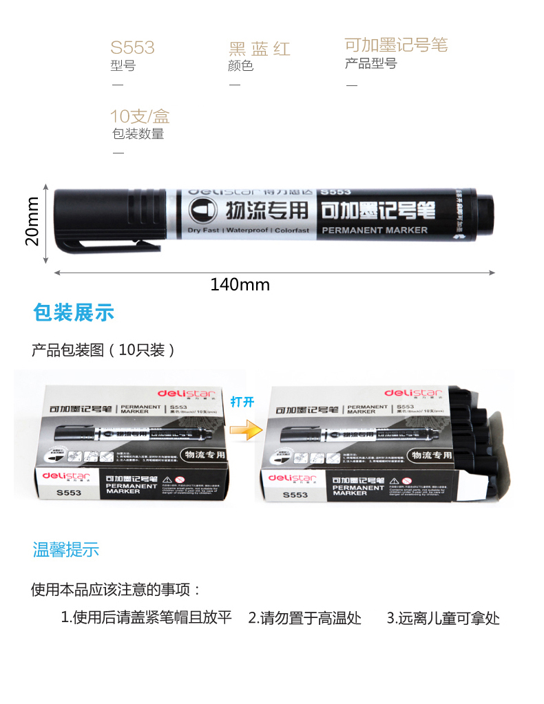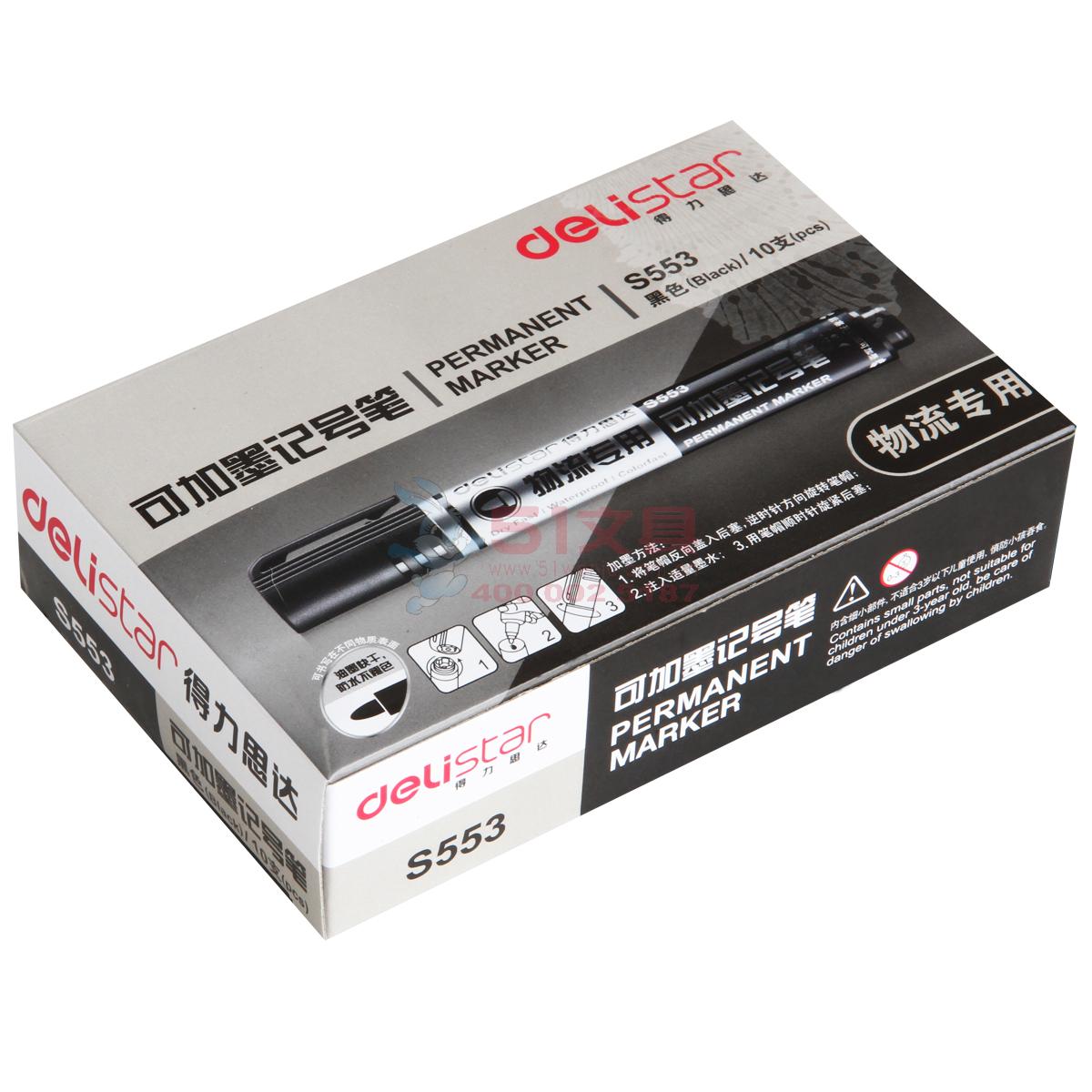 商品名称:得力S553,加墨水记号笔快递物流粗油性笔耐用快干大箱头笔记号笔 商品编号:11.03.11.0553 品牌:得力/deli 上架时间:2018-09-16 商品毛重:0克 包装含量:10/120/960 价格单位:支 起批量:中包 如果您发现商品信息不准确,欢迎纠错;如果您发现有比51文具价格更低的,欢迎举报