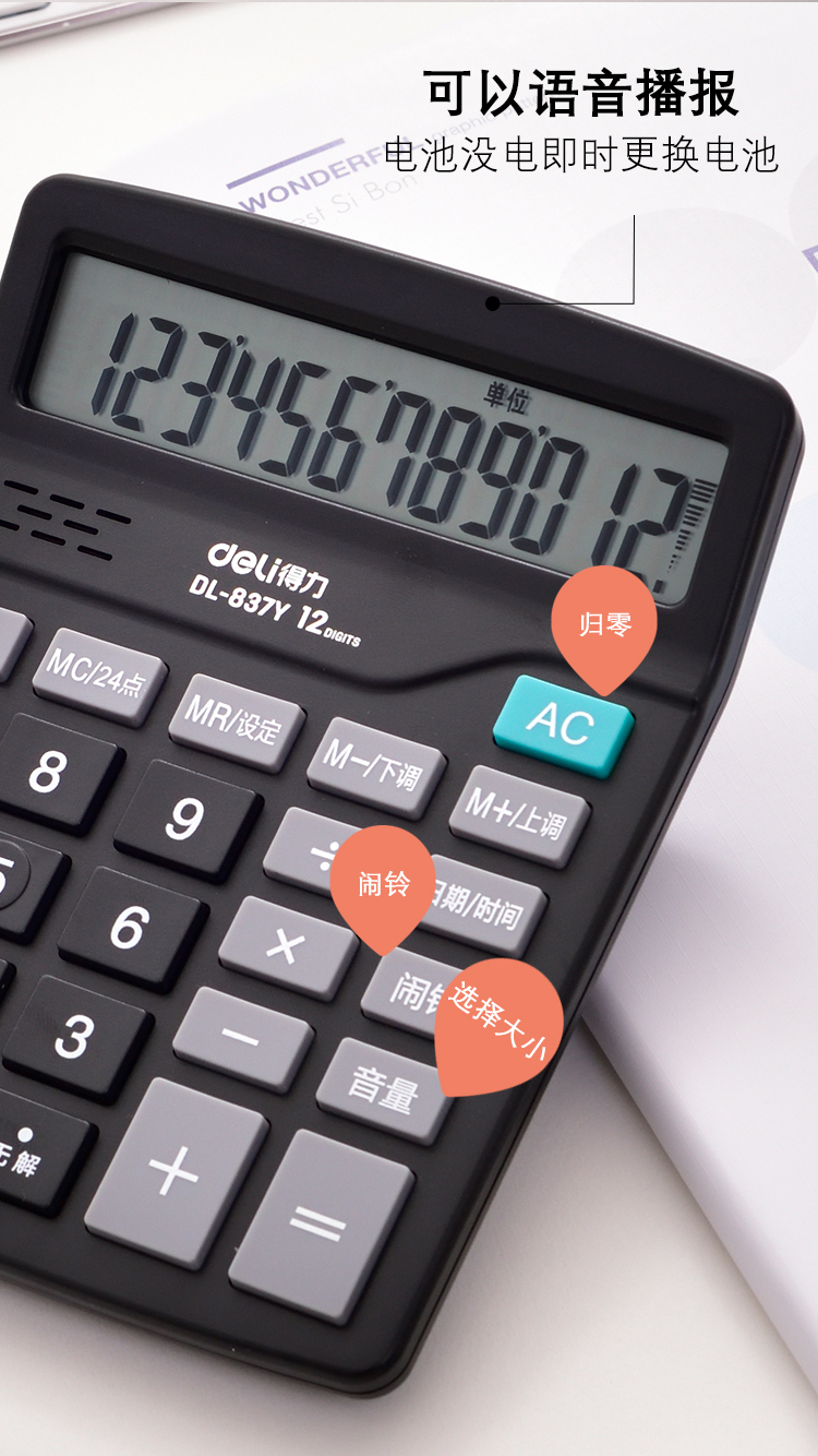 商品名称:得力837Y,语音计算器(1/20/120)得力计算器桌面计数器商务带声音计算器 商品编号:12.04.01.0837Y 品牌:文具/LZN 上架时间:2018-11-06 商品毛重:0克 如果您发现商品信息不准确,欢迎纠错;如果您发现有比51文具价格更低的,欢迎举报