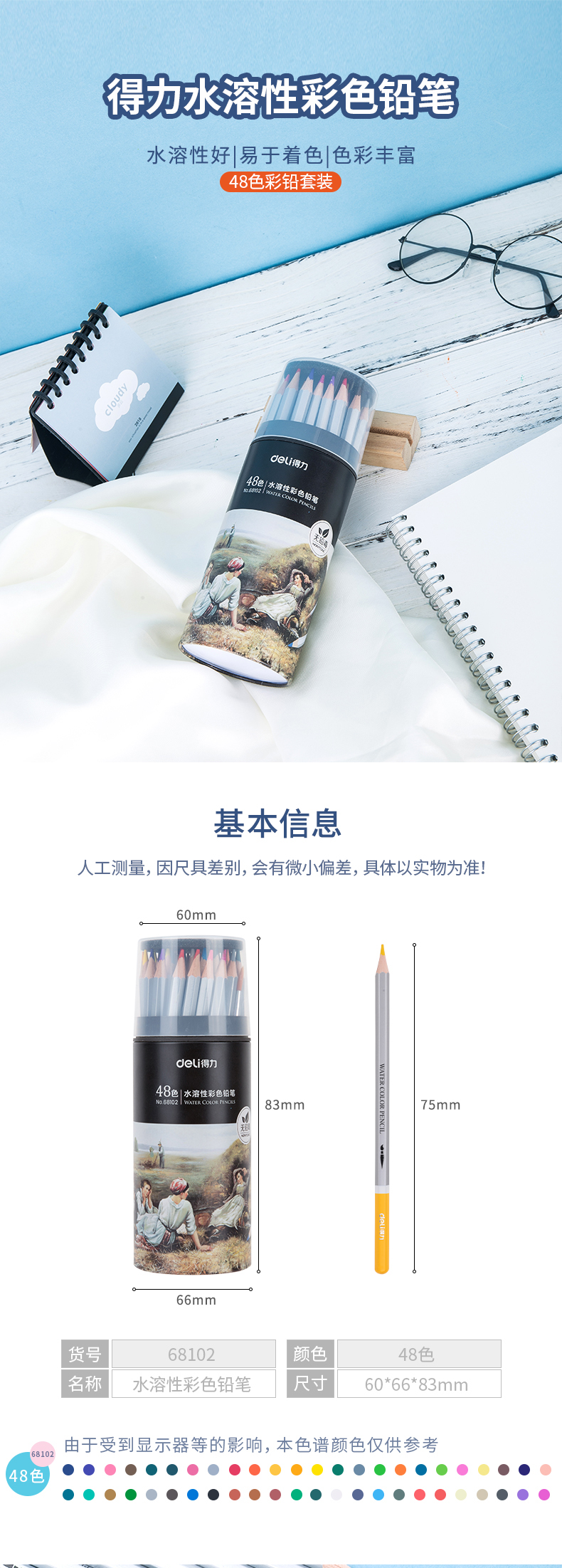 商品名称:得力68102,48色水溶性彩铅学生用彩色铅笔彩铅(1/12/48)手绘笔美术用品安全无铅毒 商品编号:11.05.03.68102 品牌:得力/deli 上架时间:2018-11-17 商品毛重:0克 颜色数:48色 包装含量:1/12/48 如果您发现商品信息不准确,欢迎纠错;如果您发现有比51文具价格更低的,欢迎举报
