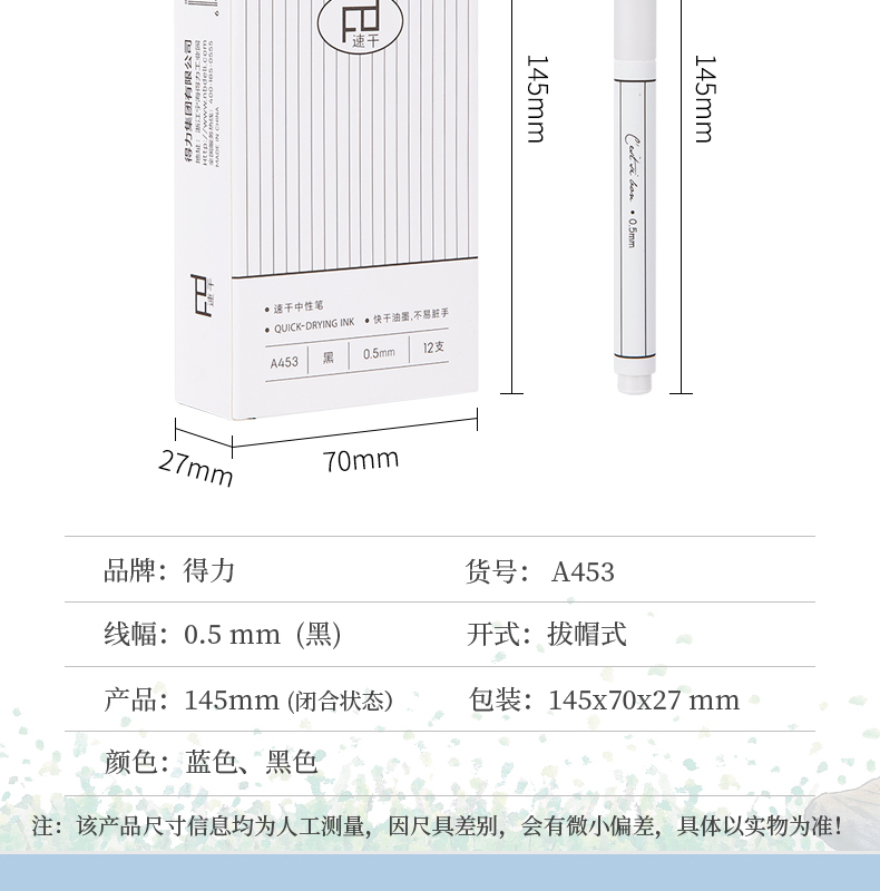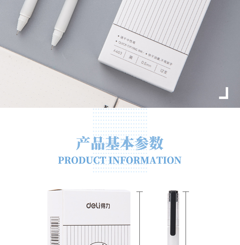商品名称:得力A453,0.5mm速干中性笔(12/144/1728)全针管中性笔卡通方格商务签字笔水笔 商品编号:11.03.01.0453 品牌:得力/deli 上架时间:2018-12-01 商品毛重:0克 价格单位:支 笔头类型:全针管 笔头粗细:0.5mm 包装含量:12/144/1728 如果您发现商品信息不准确,欢迎纠错;如果您发现有比51文具价格更低的,欢迎举报