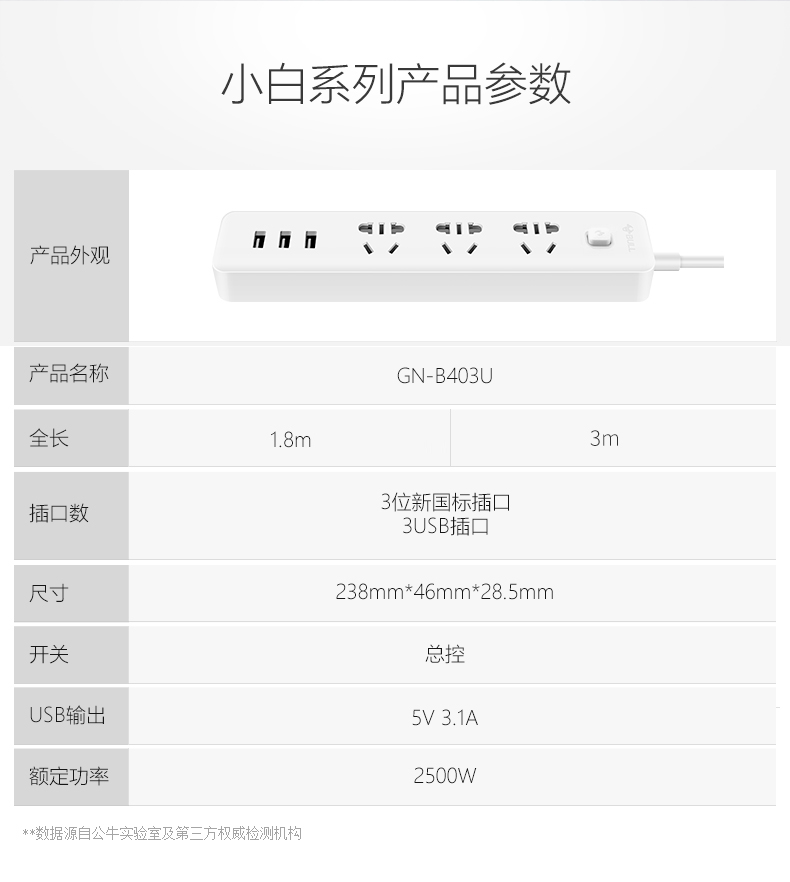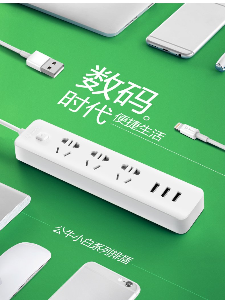 商品名称:公牛B403U,小白插座(1/60)GN B403U智能分流USB充电3.1A排插接线板插板插排 商品编号:85.53.01.0403U 品牌:公牛/BULL 上架时间:2018-12-11 商品毛重:0克 如果您发现商品信息不准确,欢迎纠错;如果您发现有比51文具价格更低的,欢迎举报