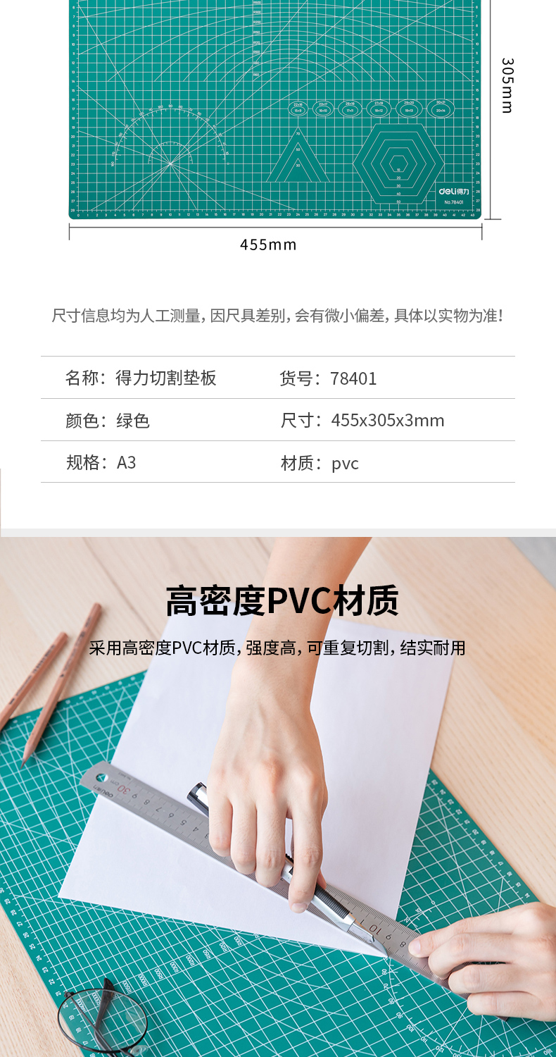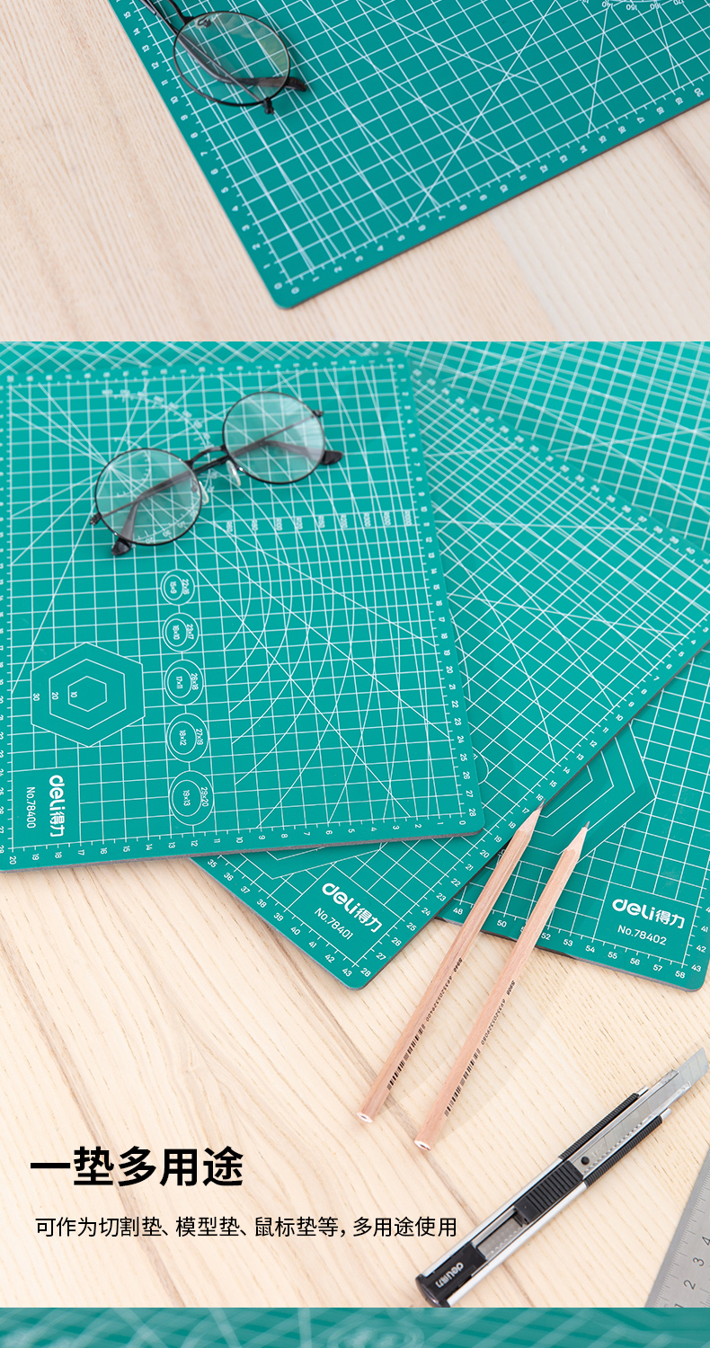 商品名称:得力78401,A3规格切割垫板(1/30)模型垫鼠标垫高密度PVC材质可重复切割 商品编号:12.02.24.78401 品牌:得力/deli 上架时间:2018-12-14 商品毛重:0克 如果您发现商品信息不准确,欢迎纠错;如果您发现有比51文具价格更低的,欢迎举报