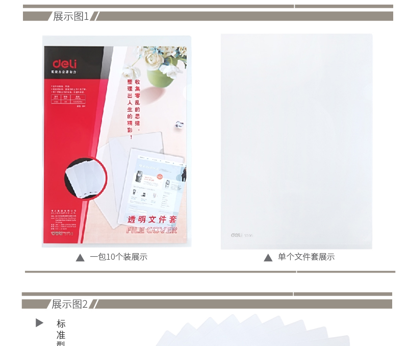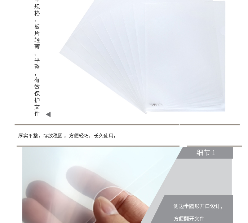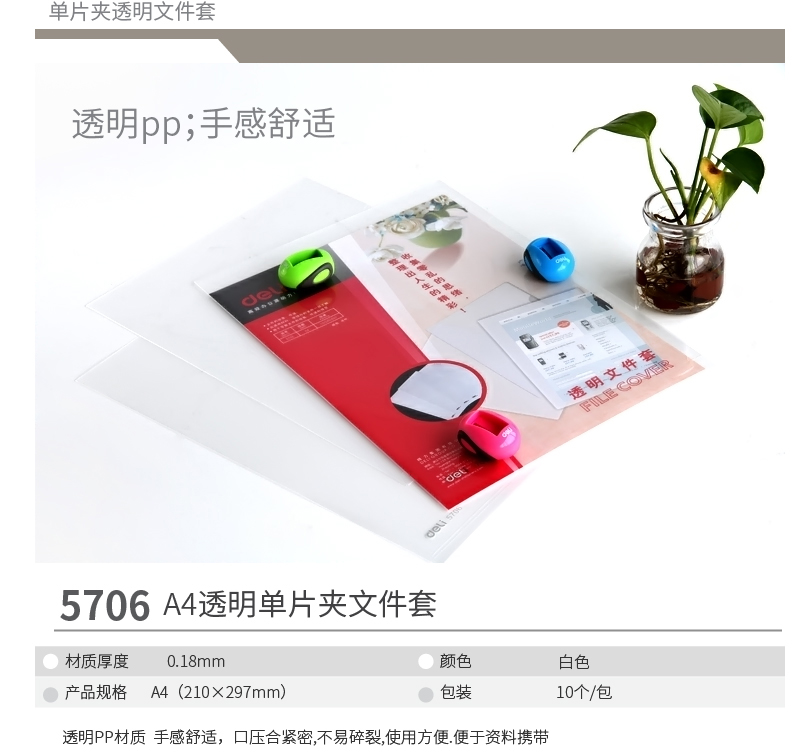 商品名称:得力5706,两页文件套,L夹-单个价格 商品编号:12.01.05.5706 品牌:文具/LZN 上架时间:2014-09-23 商品毛重:0克 规格:A4 板材厚度:0.3mm 含量:10/240/960 起订量:包(10PCS) 条码:6921734957061 如果您发现商品信息不准确,欢迎纠错;如果您发现有比51文具价格更低的,欢迎举报