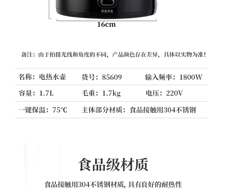商品名称:得力85609,1.7L双层不锈钢电热水壶(1/8)水壶双层不锈钢无缝内胆烧水壶自动断电304不锈钢水壶 商品编号:12.08.83.85609 品牌:文具/LZN 上架时间:2019-01-22 商品毛重:0克 如果您发现商品信息不准确,欢迎纠错;如果您发现有比51文具价格更低的,欢迎举报