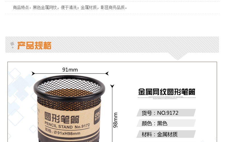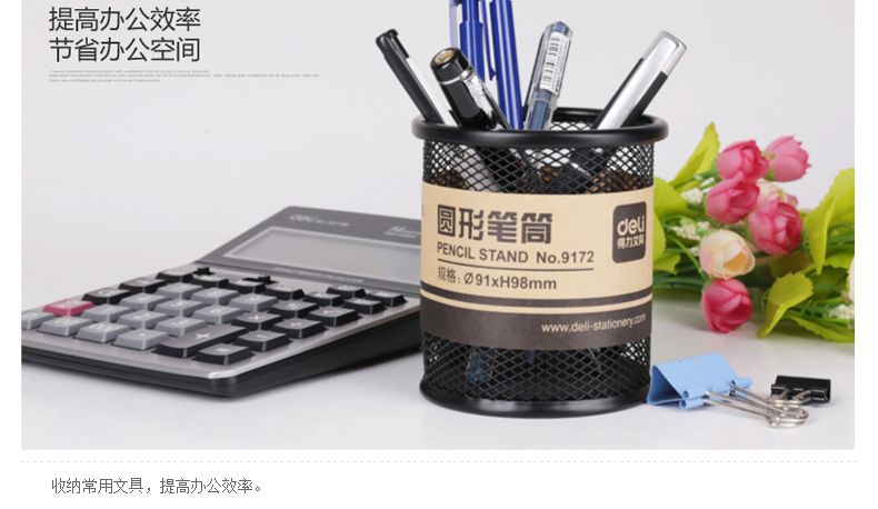 商品名称:得力9172,金属网纹圆形笔筒( 笔插 办公文具 笔类收纳 商品编号:12.02.12.9172 品牌:文具/LZN 上架时间:2019-02-01 商品毛重:0克 如果您发现商品信息不准确,欢迎纠错;如果您发现有比51文具价格更低的,欢迎举报