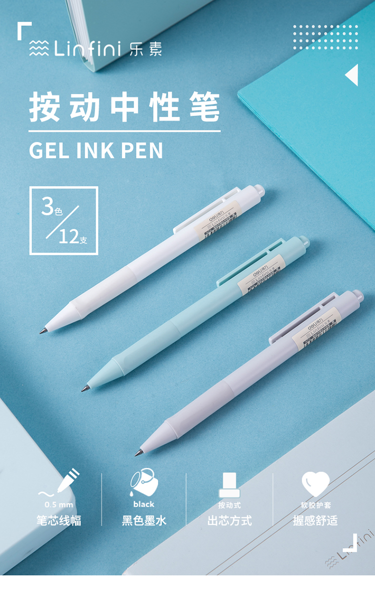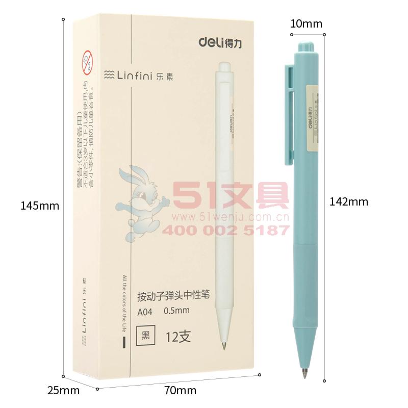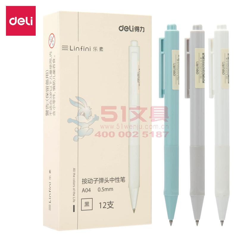 商品名称:得力A04,乐素0.5mm黑色按动中性笔(12/144/1728)子弹头水笔签字笔 商品编号:11.03.01.0004 品牌:得力/deli 上架时间:2019-02-28 商品毛重:0克 价格单位:支 笔头类型:全针管 笔头粗细:0.5mm 包装含量:12/144/1728 如果您发现商品信息不准确,欢迎纠错;如果您发现有比51文具价格更低的,欢迎举报