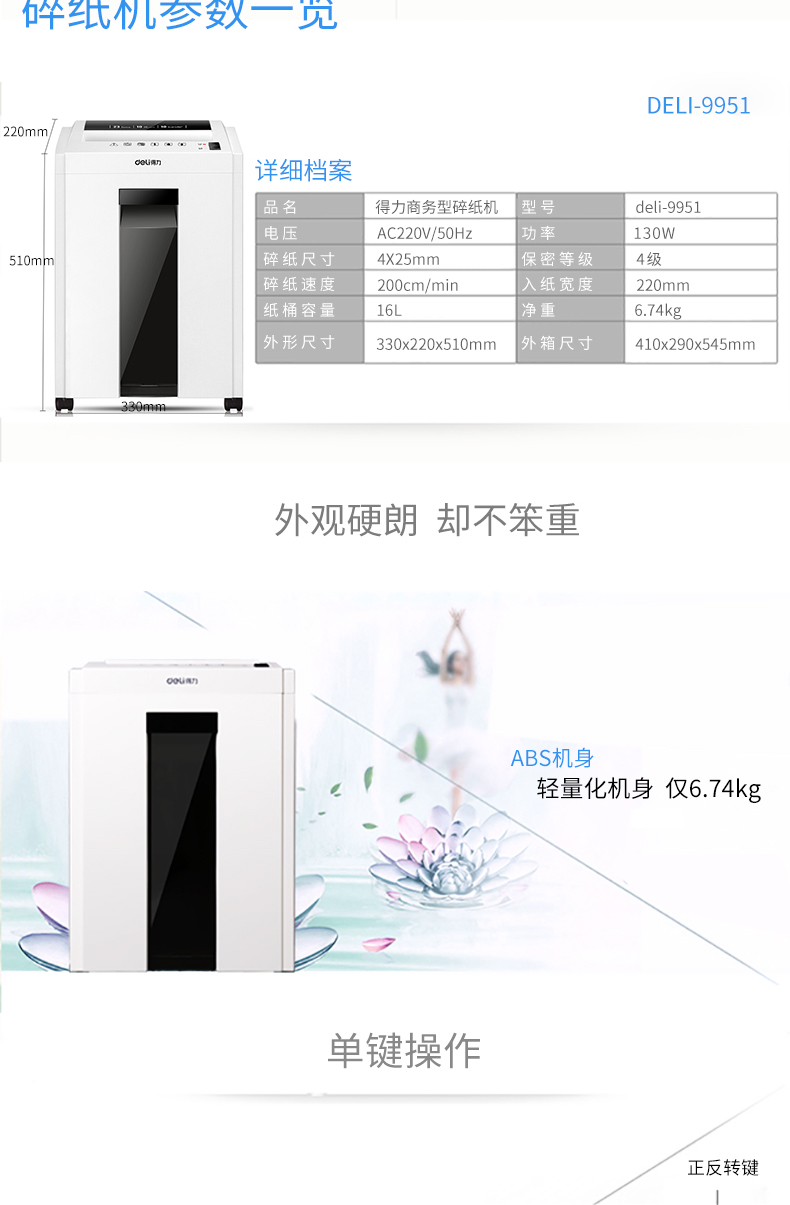商品名称:得力9951,碎纸机办公家用静音电动文件粉碎机大功率大容量碎纸机 商品编号:ECS011705 品牌:文具/LZN 上架时间:2019-02-28 商品毛重:0克 如果您发现商品信息不准确,欢迎纠错;如果您发现有比51文具价格更低的,欢迎举报