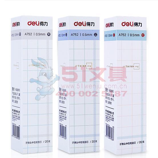 商品名称:得力A752,0.5mm子弹头签字笔通用替芯(20/240/2880)碳素笔学生黑色笔芯 商品编号:11.03.03.0752 品牌:得力/deli 上架时间:2019-03-11 商品毛重:0克 价格单位:支 笔头类型:子弹头 笔头粗细:0.5mm 包装含量:20/240/2880 如果您发现商品信息不准确,欢迎纠错;如果您发现有比51文具价格更低的,欢迎举报