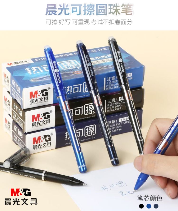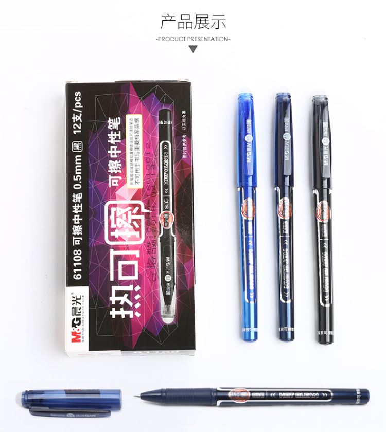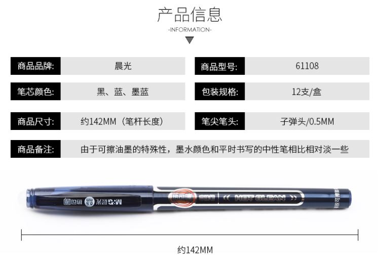 商品名称:晨光AKP61108,0.5mm热可擦中性笔(12/144/1728)黑色/晶蓝/墨蓝可涂改能擦掉的中性笔 商品编号:61.03.01.61108A 品牌:晨光/M&G 上架时间:2019-04-08 商品毛重:0克 价格单位:支 笔头类型:全针管 笔头粗细:0.5mm 包装含量:12/144/1728 如果您发现商品信息不准确,欢迎纠错;如果您发现有比51文具价格更低的,欢迎举报