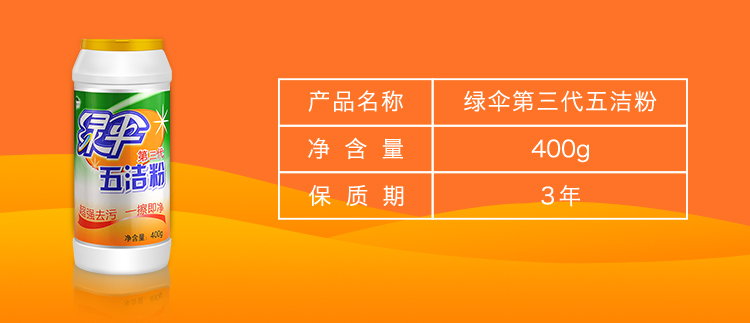 商品名称:绿伞400g,去污粉五洁粉厨房油污清洁剂不锈钢水槽除锈除垢去油去污抛光剂 商品编号:89.21.9122 品牌:其他 上架时间:2019-06-24 商品毛重:0克 如果您发现商品信息不准确,欢迎纠错;如果您发现有比51文具价格更低的,欢迎举报
