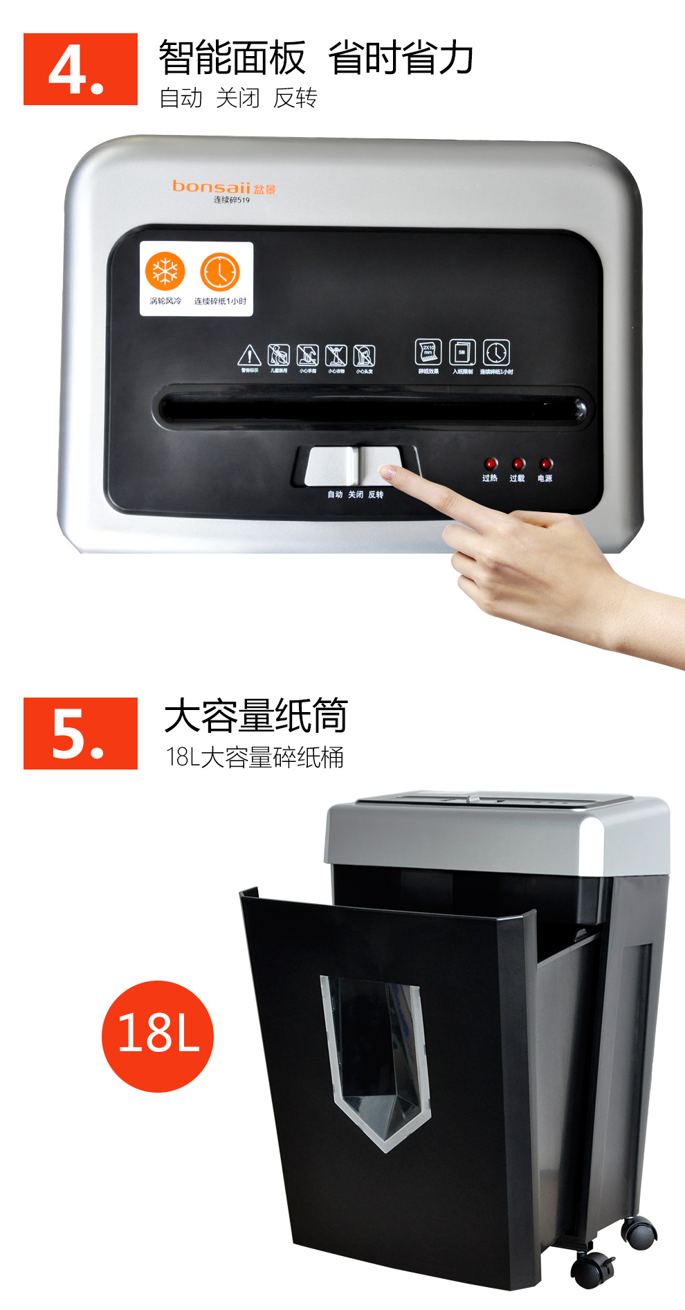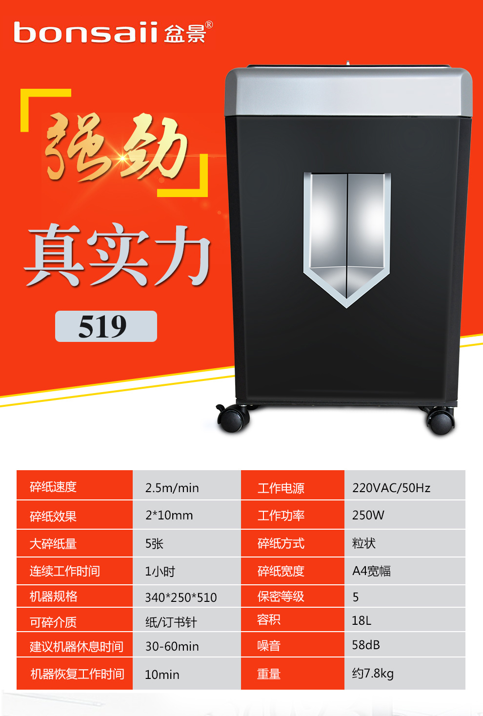 商品名称:盆景519碎纸机 中小单位办公静音电动粉碎机 德国五级高保密颗粒状 碎纸1小时一次碎5张2*10mm 商品编号:ECS012359 品牌:盆景/bonsaii 上架时间:2019-07-09 商品毛重:0克 如果您发现商品信息不准确,欢迎纠错;如果您发现有比51文具价格更低的,欢迎举报