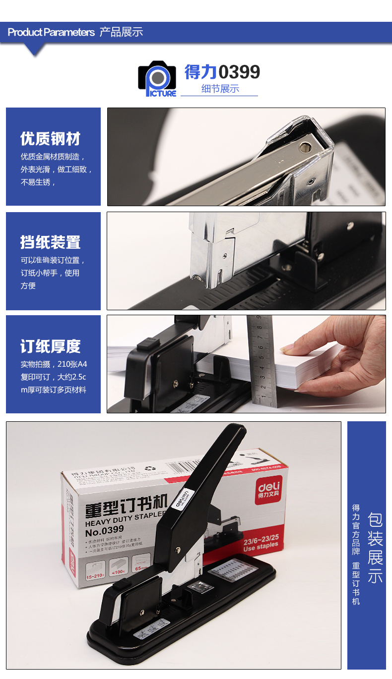 商品名称:得力0399,210页厚层订书机 23/24 商品编号:12.02.01.0145 品牌:文具/LZN 上架时间:2014-09-23 商品毛重:0克 类型:重型订书机 含量:1/6 起订量:个 如果您发现商品信息不准确,欢迎纠错;如果您发现有比51文具价格更低的,欢迎举报
