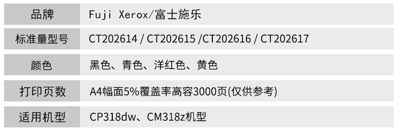商品名称:富士施乐cm318z墨粉 彩色碳粉 粉筒标准容量 CT202615 CT202616 CT202617 商品编号:ECS012894 品牌:富士施乐/FujiXerox 上架时间:2021-04-18 商品毛重:0克 型号:cm318z 如果您发现商品信息不准确,欢迎纠错;如果您发现有比51文具价格更低的,欢迎举报