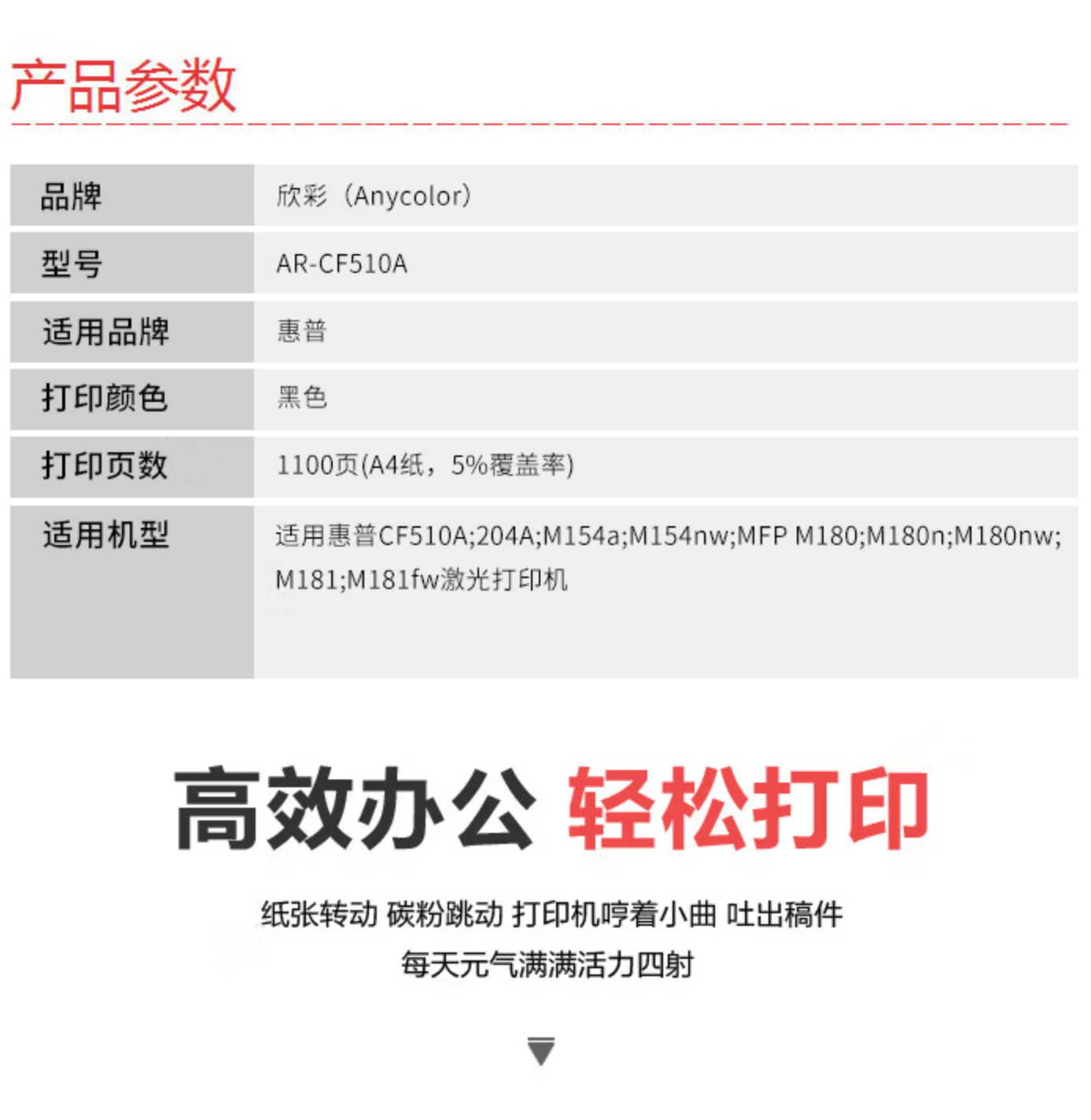 商品名称:欣彩AR-CF510A黑色硒鼓ZF 大众版 适用惠普CF510A 204A M154a M154nw MFP M180 M180n M180nw M181激光打印机 商品编号:ECS013253 品牌:欣彩/Anycolor 上架时间:2022-09-14 商品毛重:0克 型号:欣彩180 如果您发现商品信息不准确,欢迎纠错;如果您发现有比51文具价格更低的,欢迎举报