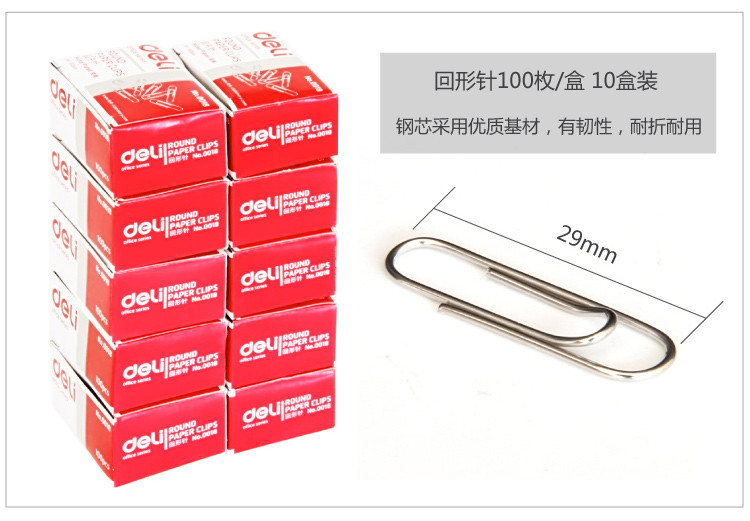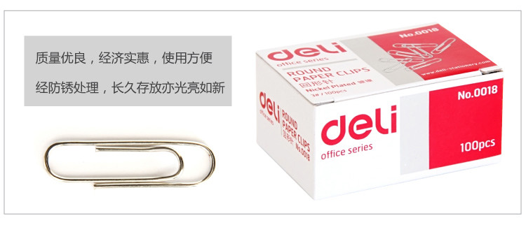 商品名称:得力0018,防锈回形针(1/10/500)100枚纸盒装回形针/曲别针 商品编号:12.02.04.0018 品牌:文具/LZN 上架时间:2014-09-23 商品毛重:0克 含量:1/10/500 起订量:盒 如果您发现商品信息不准确,欢迎纠错;如果您发现有比51文具价格更低的,欢迎举报