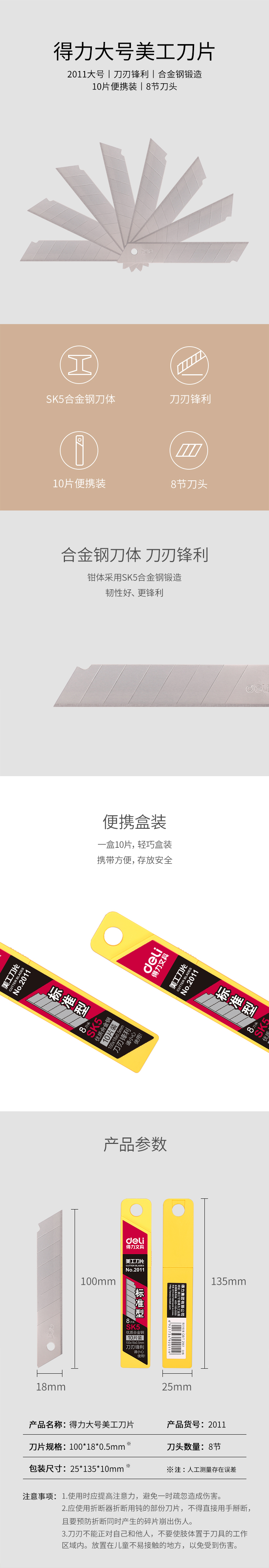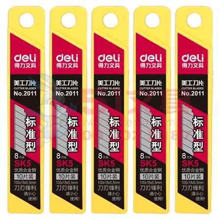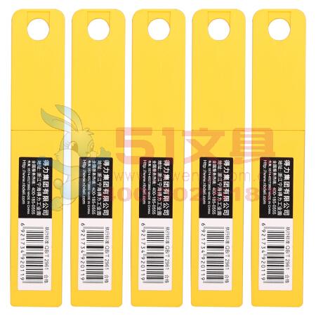 商品名称:得力2011,大号美工刀片(1/20/160)18mm美工刀片,大号加厚合金钢美工刀片(10片/盒) 商品编号:12.02.15.2011 品牌:文具/LZN 上架时间:2014-09-23 商品毛重:0克 规格:0.5*18*100mm 含量:1/20/160 起订量:盒 如果您发现商品信息不准确,欢迎纠错;如果您发现有比51文具价格更低的,欢迎举报