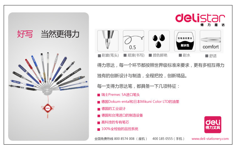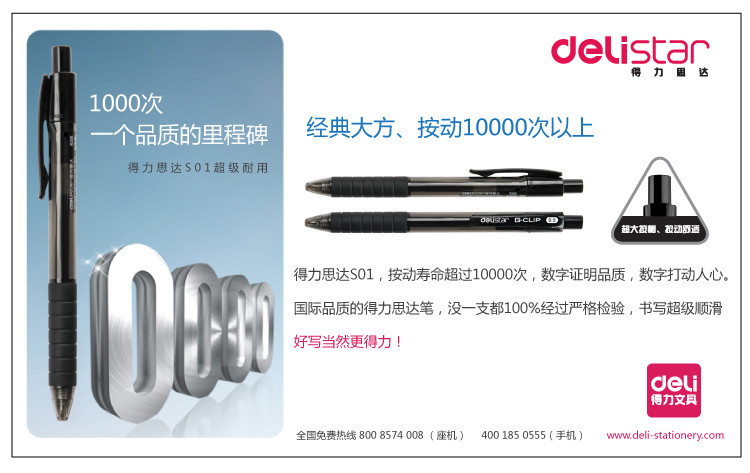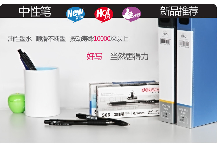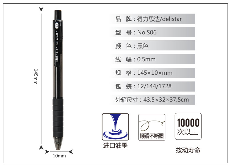 商品名称:得力S06,按动型办公中性笔-0.5mm 商品编号:11.03.01.0006 品牌:得力/deli 上架时间:2014-05-22 商品毛重:0克 价格单位:支 笔头类型:子弹头 笔头粗细:0.7mm 包装含量:12/144/1728 如果您发现商品信息不准确,欢迎纠错;如果您发现有比51文具价格更低的,欢迎举报