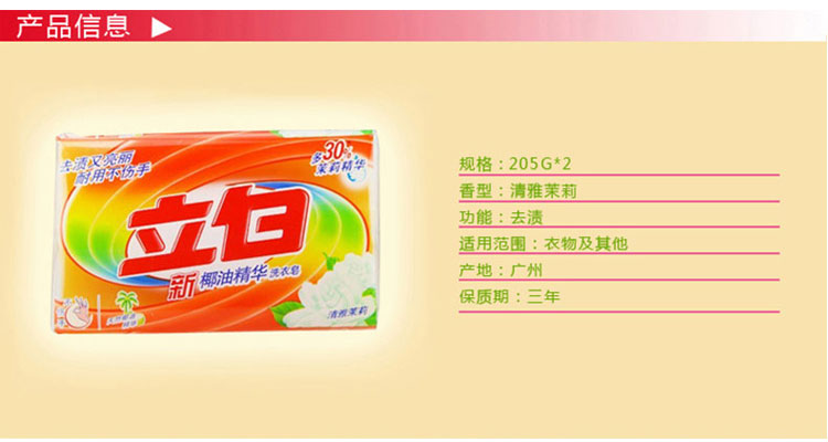 商品名称:立白透明皂(1/48)立白202g洗衣皂 商品编号:34.03.01.001 品牌:立白/Liby 上架时间:2015-03-11 商品毛重:0克 包装含量:1/48 保质期:三年 产品类别:肥皂 如果您发现商品信息不准确,欢迎纠错;如果您发现有比51文具价格更低的,欢迎举报
