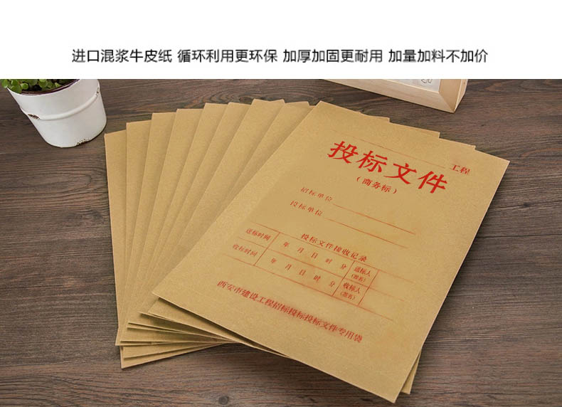 商品名称:A4进口牛皮纸投标文件袋-(10只装)-商务标(陕建版) 商品编号:41.01.04.012 品牌:其他 上架时间:2015-04-20 商品毛重:0克 产品类型:档案袋 规格:A4 含量:1/100 起批量:包(10个装) 如果您发现商品信息不准确,欢迎纠错;如果您发现有比51文具价格更低的,欢迎举报