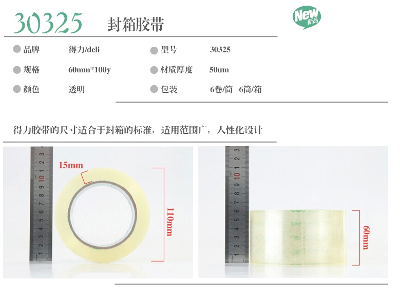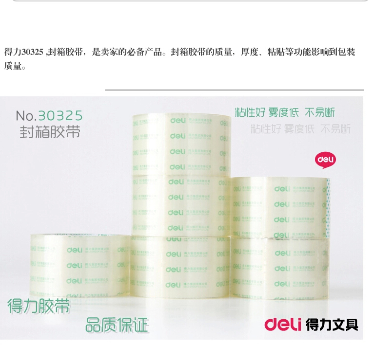 商品名称:得力30325,超透封箱胶带-60*100y-爆款 商品编号:12.09.01.0325 品牌:文具/LZN 上架时间:2015-05-27 商品毛重:0克 宽度:60mm 长度:100码 包装:1/6/36 起订量:筒 如果您发现商品信息不准确,欢迎纠错;如果您发现有比51文具价格更低的,欢迎举报