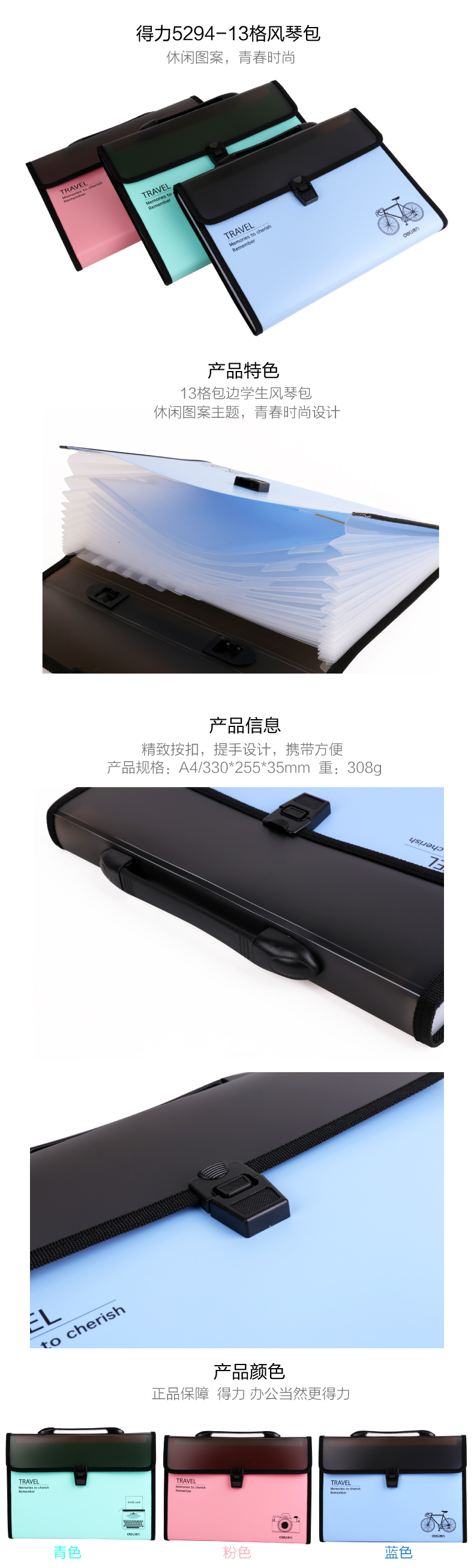 商品名称:得力5294,13格包边学生风琴包 商品编号:11.02.05.5294 品牌:得力/deli 上架时间:2015-10-15 商品毛重:0克 规格:13格 含量:1/12/36 如果您发现商品信息不准确,欢迎纠错;如果您发现有比51文具价格更低的,欢迎举报