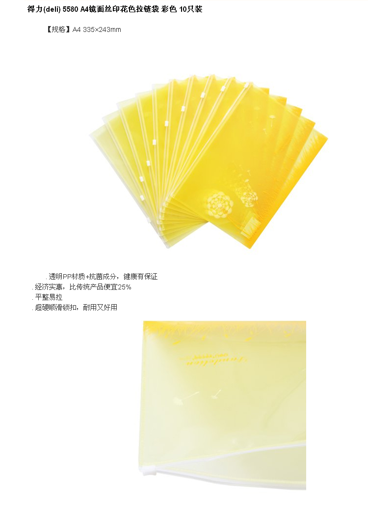 商品名称:得力5580,A4学生PP拉边袋 商品编号:12.01.05.5580 品牌:文具/LZN 上架时间:2015-10-15 商品毛重:0克 含量:10*150*600 如果您发现商品信息不准确,欢迎纠错;如果您发现有比51文具价格更低的,欢迎举报