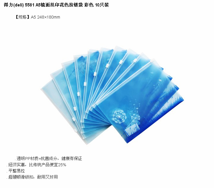 商品名称:得力5581,A5学生PP拉边袋 商品编号:12.01.05.5581 品牌:文具/LZN 上架时间:2017-10-09 商品毛重:0克 规格:A5 含量:10/240/960 如果您发现商品信息不准确,欢迎纠错;如果您发现有比51文具价格更低的,欢迎举报