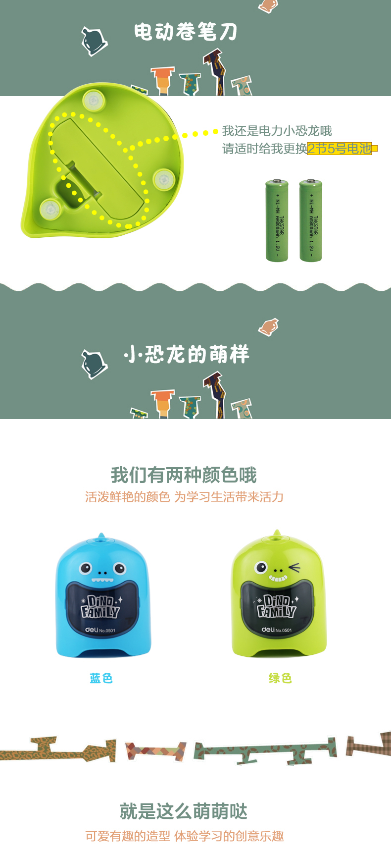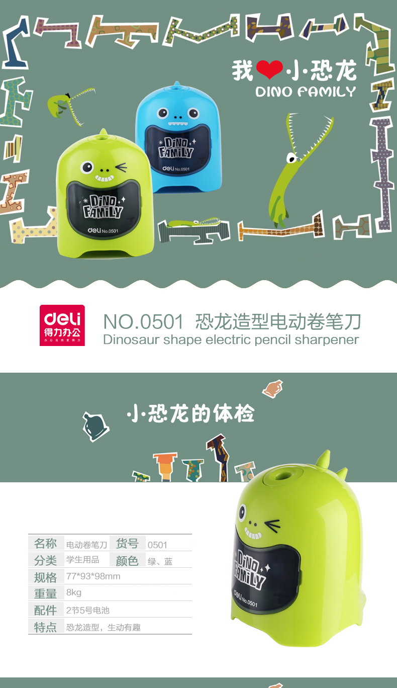 商品名称:得力0501,恐龙电动削笔机(1/45) 商品编号:12.11.25.0501 品牌:得力/deli 上架时间:2015-10-22 商品毛重:0克 如果您发现商品信息不准确,欢迎纠错;如果您发现有比51文具价格更低的,欢迎举报