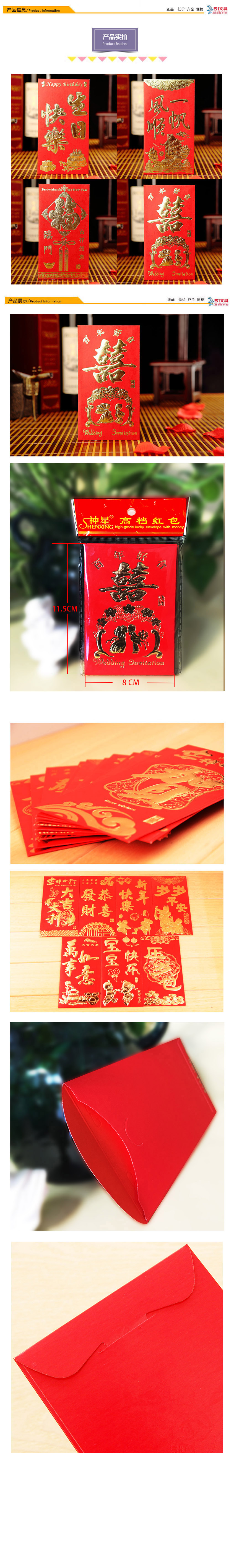 商品名称:小号红包“喜”字-6个/包(1/450)可装500元红包,喜字红包套 利事封 商品编号:81.05.11.0101 品牌:其他 上架时间:2016-01-11 商品毛重:0克 含量:1/450 如果您发现商品信息不准确,欢迎纠错;如果您发现有比51文具价格更低的,欢迎举报