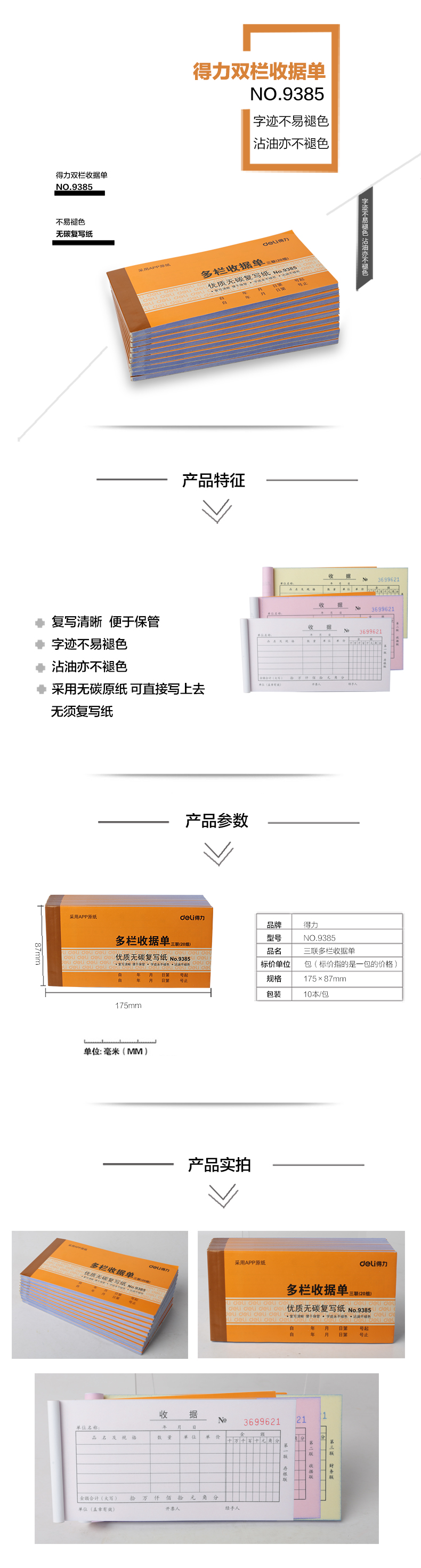 商品名称:得力9385,三联多栏收据 凭证 财务用品 商品编号:12.05.49.9385 品牌:文具/LZN 上架时间:2016-01-12 商品毛重:0克 如果您发现商品信息不准确,欢迎纠错;如果您发现有比51文具价格更低的,欢迎举报