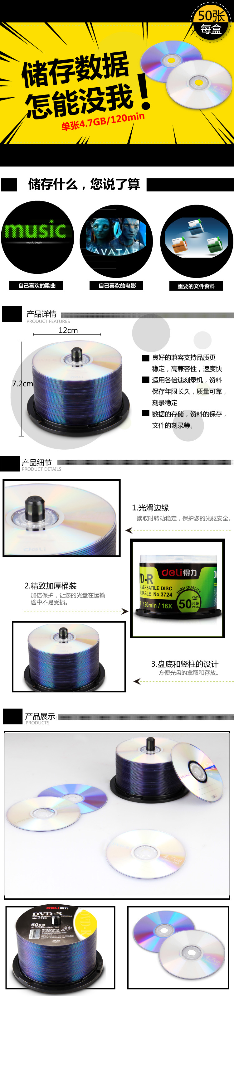 商品名称:得力3724,DVD光盘(50片装),可记录式DVD光盘 刻录盘空白光盘 商品编号:12.07.71.3724 品牌:文具/LZN 上架时间:2016-01-13 商品毛重:0克 如果您发现商品信息不准确,欢迎纠错;如果您发现有比51文具价格更低的,欢迎举报