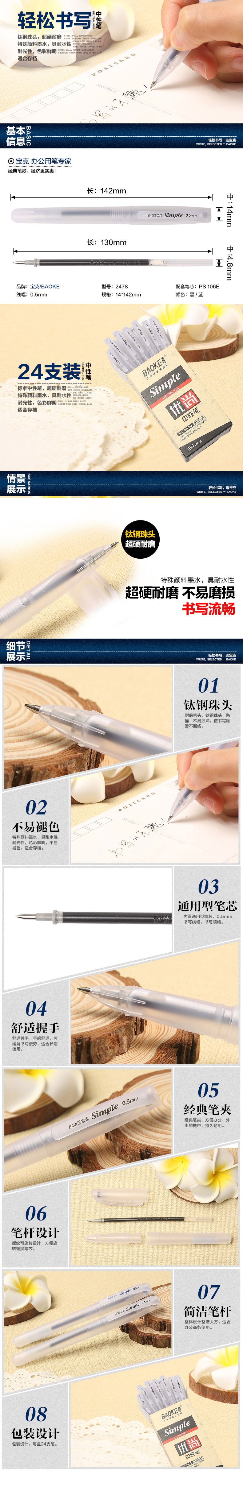 商品名称:2478 宝克 0.5mm中性笔-黑色 商品编号:14.01.01.2478 品牌:宝克/BAOKE 上架时间:2016-07-02 商品毛重:0克 价格单位:支 笔头类型:子弹头 笔头粗细:0.5mm 包装含量:12支/盒,144支/条,1728支/件 如果您发现商品信息不准确,欢迎纠错;如果您发现有比51文具价格更低的,欢迎举报