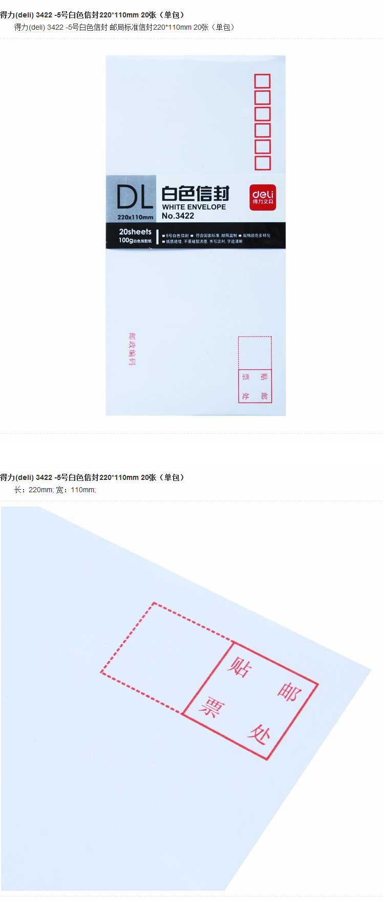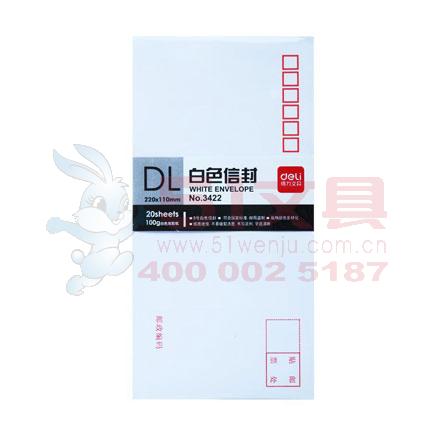 商品名称:得力3422,白色信封-5号DL 商品编号:12.05.50.3422 品牌:文具/LZN 上架时间:2016-09-26 商品毛重:0克 含量:1/150 起批量:包 如果您发现商品信息不准确,欢迎纠错;如果您发现有比51文具价格更低的,欢迎举报
