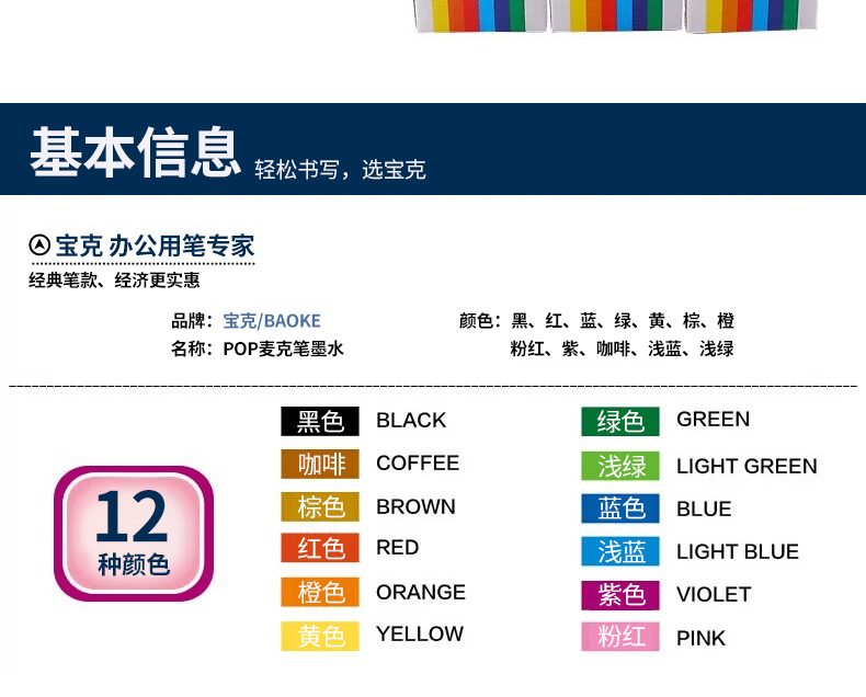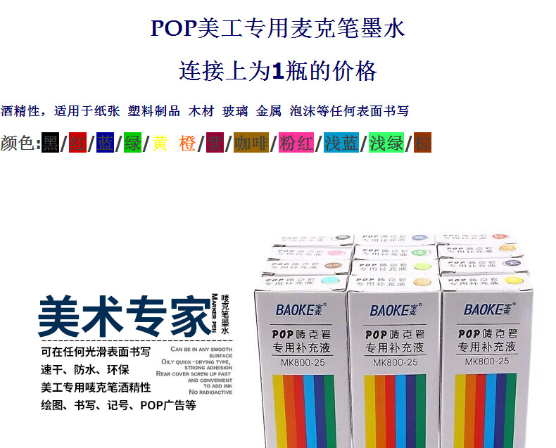 商品名称:宝克 POP补充液,POP广告笔水,唛克笔水,POP笔水,麦克笔水,马克笔水,手绘POP海报笔水 商品编号:14.01.03.0031B 品牌:宝克/BAOKE 上架时间:2016-10-06 商品毛重:0克 价格单位:瓶 起批量:小盒 包装含量:12瓶/条,240支/件 如果您发现商品信息不准确,欢迎纠错;如果您发现有比51文具价格更低的,欢迎举报