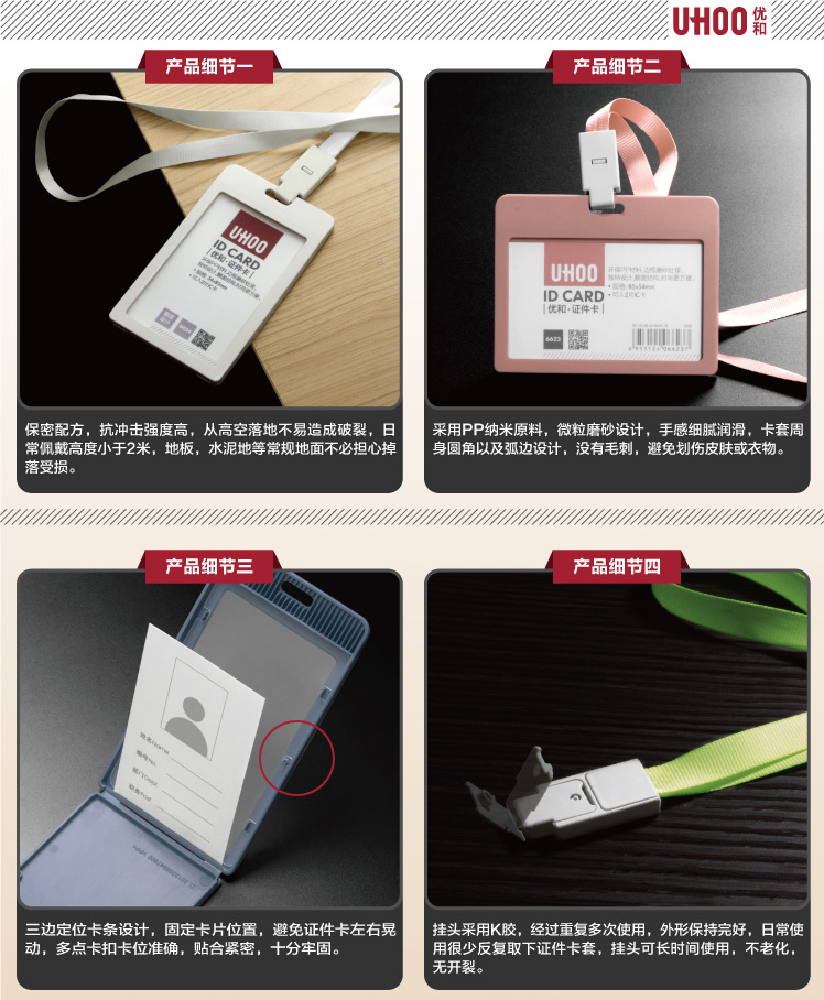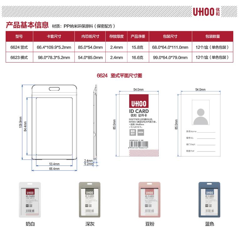 商品名称:优和6624,竖式证件卡套/胸卡/工作证/学生工牌/门禁/公交卡套/证件套/员工胸牌/厂牌 商品编号:30.01.01.6624W 品牌:优和/UHOO 上架时间:2016-11-22 商品毛重:0克 条码:6953124050786 样式:竖式 规格:6/120/720 如果您发现商品信息不准确,欢迎纠错;如果您发现有比51文具价格更低的,欢迎举报 产品特色 产品细节 适用范围