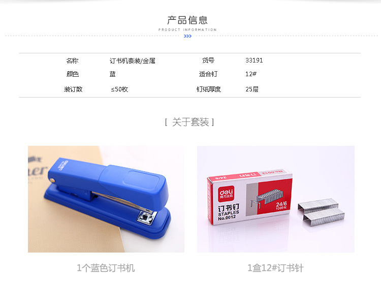 商品名称:得力33190,12#订书机组合套装 商品编号:12.02.01.0139 品牌:得力/deli 上架时间:2017-02-16 商品毛重:0克 规格:12# 含量:1/12/72 如果您发现商品信息不准确,欢迎纠错;如果您发现有比51文具价格更低的,欢迎举报