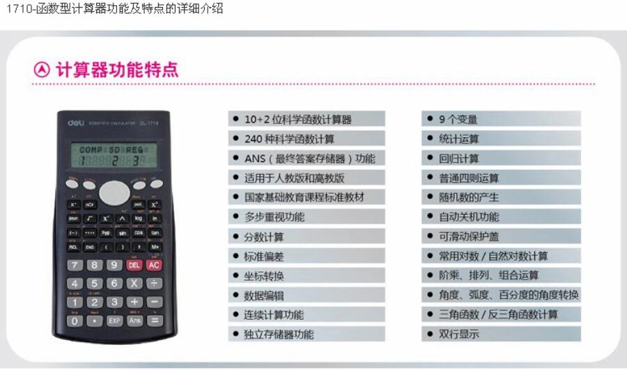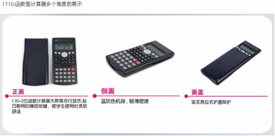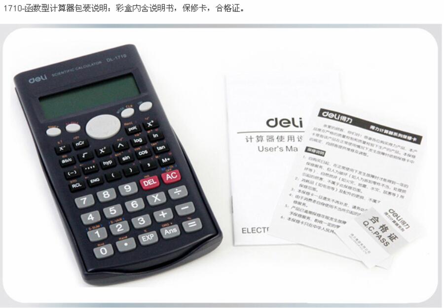 商品名称:得力1710, 函数型计算器 商品编号:12.04.31.0510 品牌:文具/LZN 上架时间:2017-02-20 商品毛重:0克 如果您发现商品信息不准确,欢迎纠错;如果您发现有比51文具价格更低的,欢迎举报