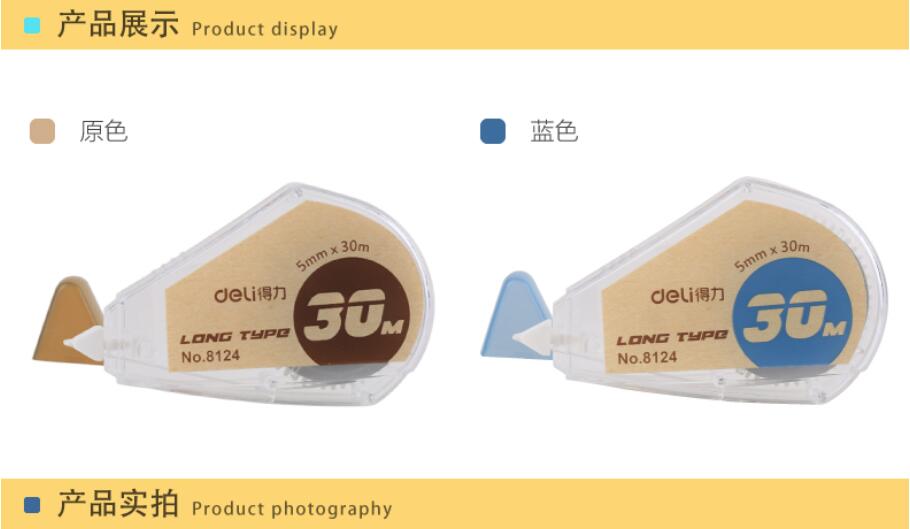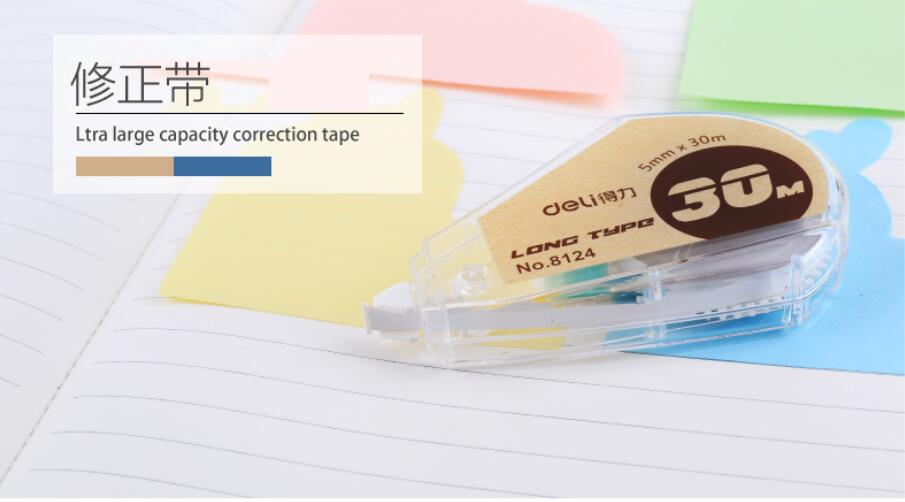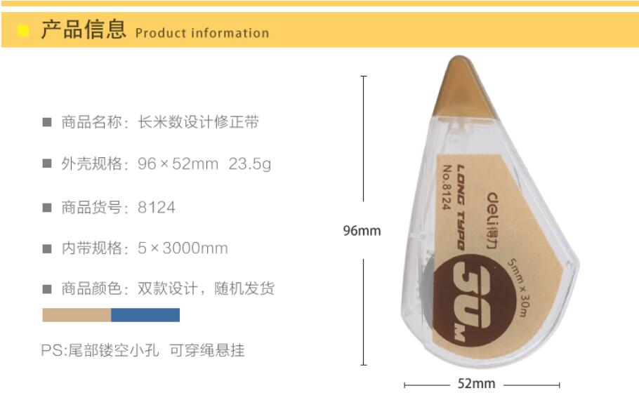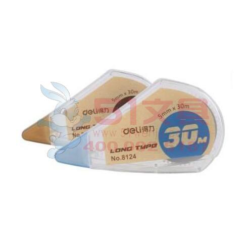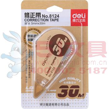 商品名称:得力8124,30米超长修正带/学生修改带/改错带/修正贴 商品编号:11.13.03.8124 品牌:得力/deli 上架时间:2017-03-28 商品毛重:0克 规格:96*52mm 含量:1/24/432 如果您发现商品信息不准确,欢迎纠错;如果您发现有比51文具价格更低的,欢迎举报