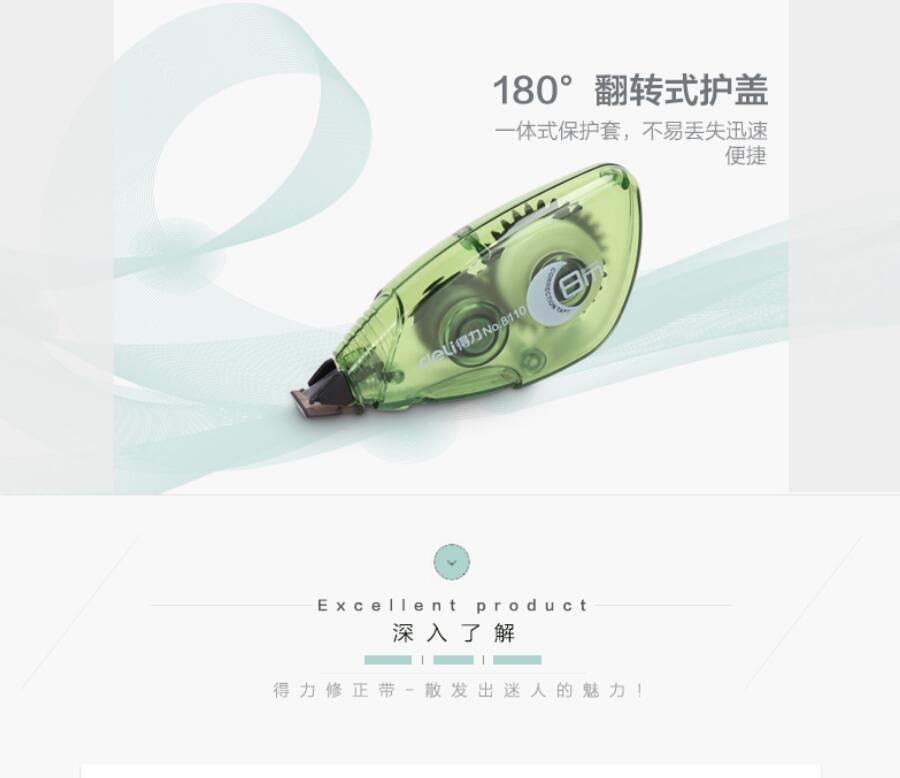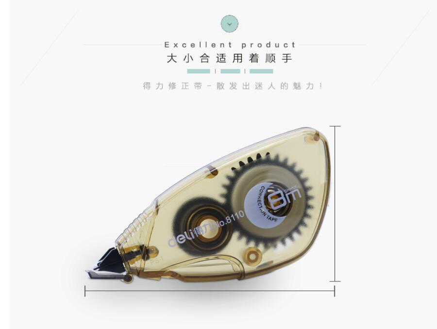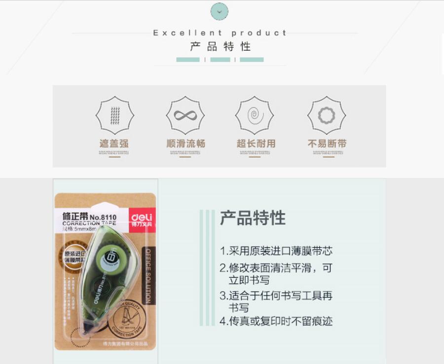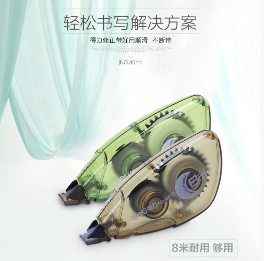 商品名称:得力8110,修正带/学生修改带/改错带/修正贴 商品编号:11.13.03.8110 品牌:得力/deli 上架时间:2017-03-28 商品毛重:0克 规格:5mm*8m 含量:1/24/432 起订量:(中包24卡) 如果您发现商品信息不准确,欢迎纠错;如果您发现有比51文具价格更低的,欢迎举报